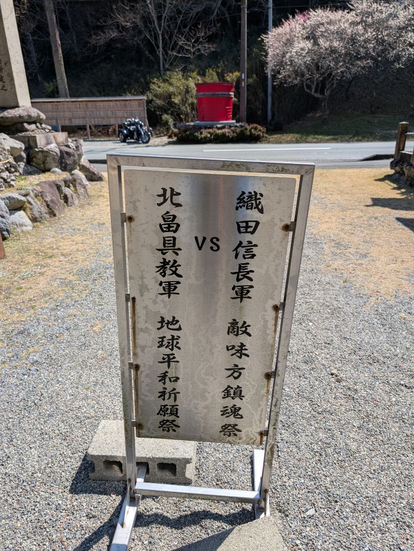 鳥居が写っている写真の真ん中に、「車馬乗入禁止」と書かれた立て看板があったのですが、ふとその裏側に「織田信長軍 vs 北畠具教軍 敵味方鎮魂祭 地球平和祈願祭」とあり、なんだろうコレと。織田氏と北畠氏は織田の伊勢攻略にあたって戦っていたので、その両軍で亡くなった方の鎮魂祭ということなんだろうかと…水屋神社にあった神社の由来などにはこれに関する表記がなかったので気になりました。