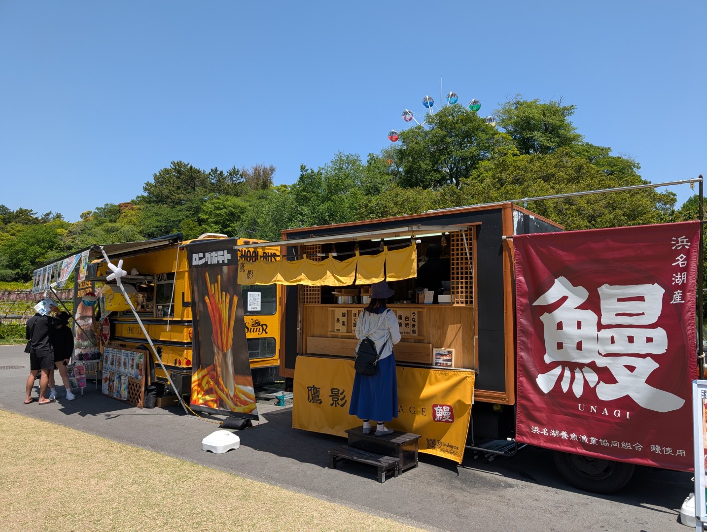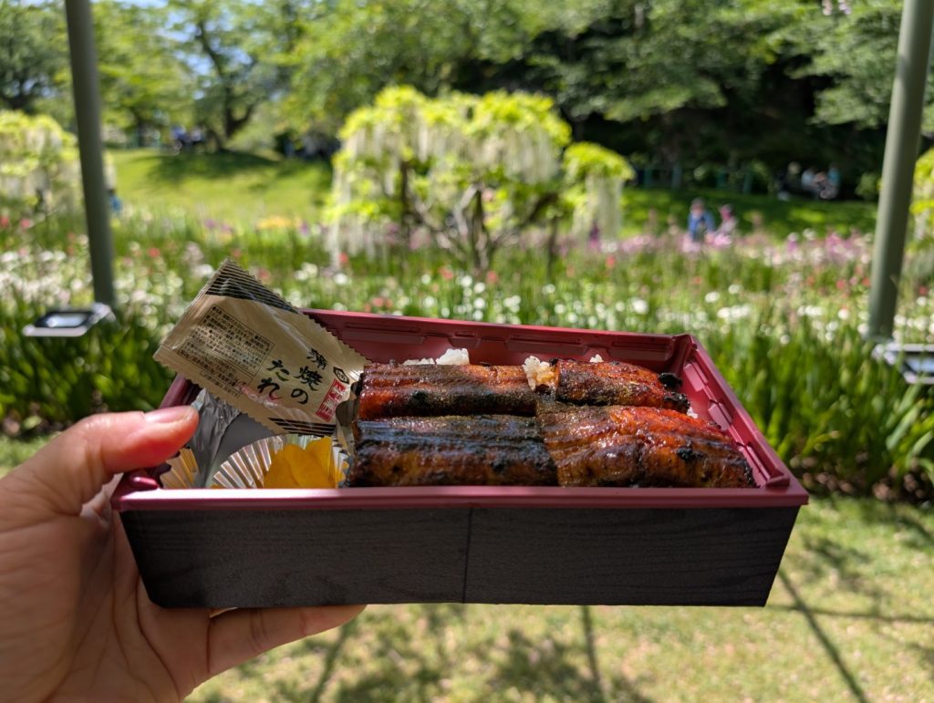 お昼には浜名湖産の鰻を出しているキッチンカーがあって、頼んでみました。頼んでから焼いてくれるので多少時間はかかるのですが、花に囲まれた場所でまさかのうな丼となりました。園内には、ローズヒップを使ったメニューを出しているショップもあって、ここでしか食べられないようなものもあります。