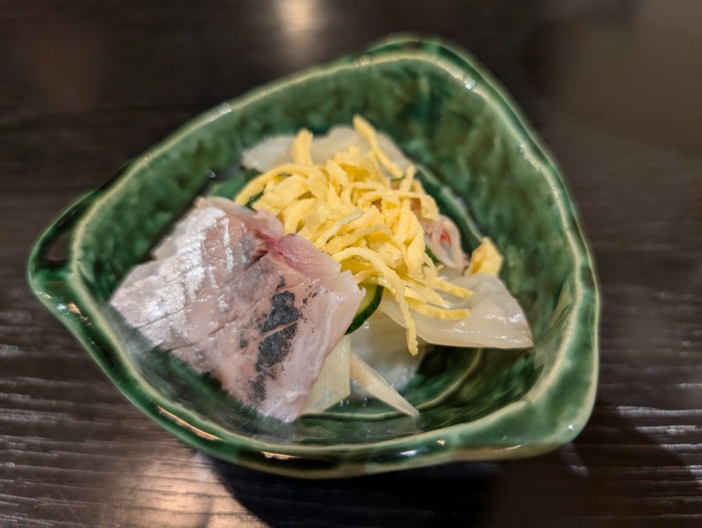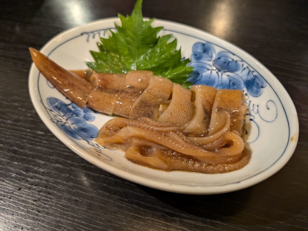 地元の方々で賑わっていて、出されたお通しがとても美味しくて期待が高まります。まず出していただいたのが「ムギイカ」の沖漬け。ムギイカとはスルメイカの子どものことで、この日沼津で上がったものを沖漬けにしたのだそうです。イカの旨味をしっかりと持ちつつも、とても柔らかくて食べやすい沖漬けで絶品、ビールが進みます。