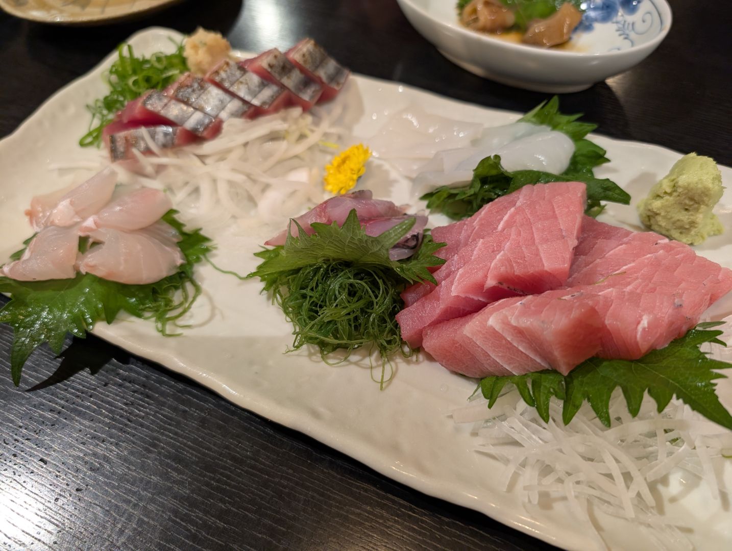 お刺身の盛り合わせでは、中トロとカツオ、イカにヒラメなど。どれも実に美味しいのですが、やはりここで食べるカツオの刺身はもちっとした食感もあって本当に美味しい。また、タチウオの塩焼きはびっくりするほど「ふわっ」とした食感でこれも絶品。