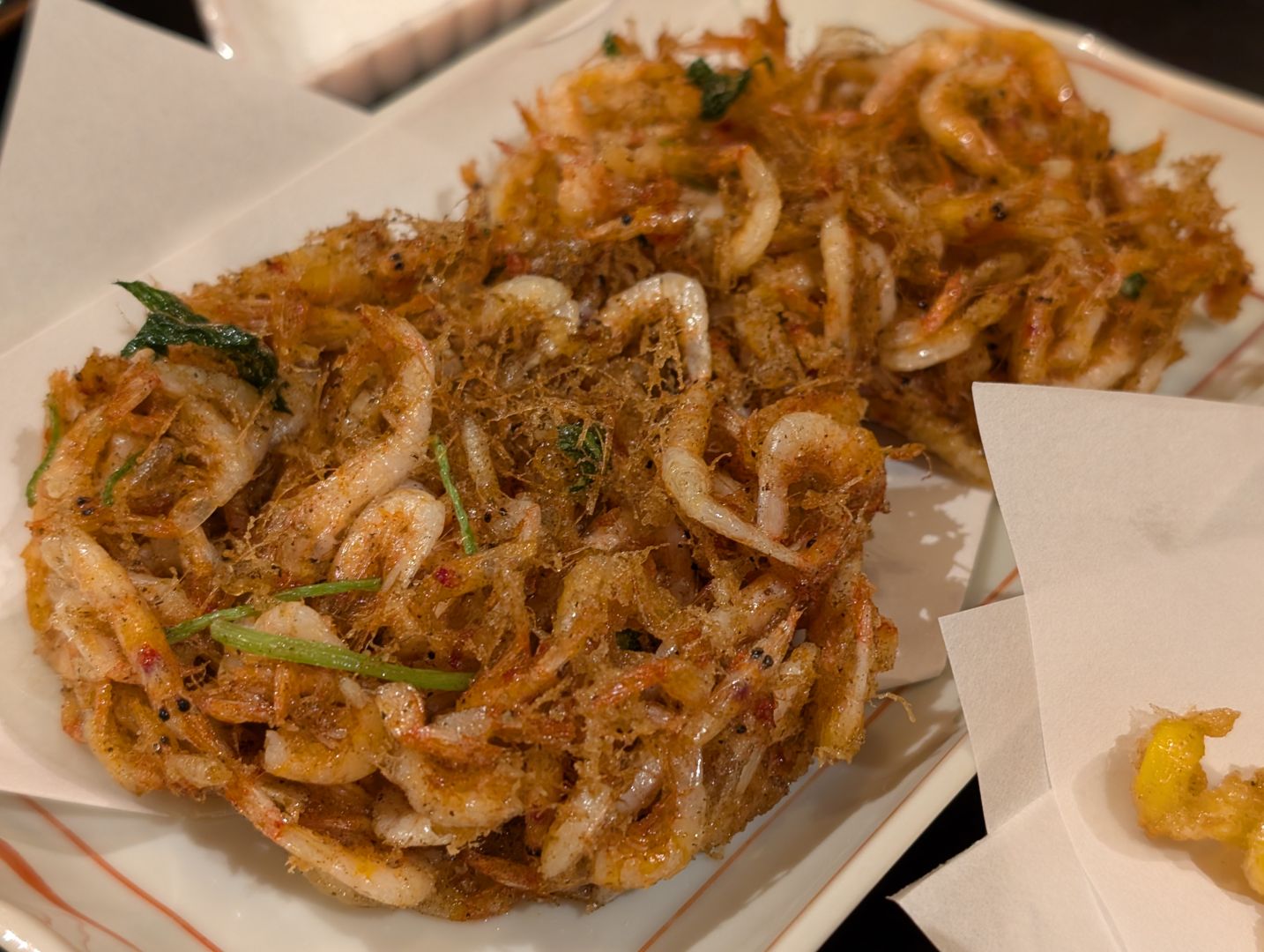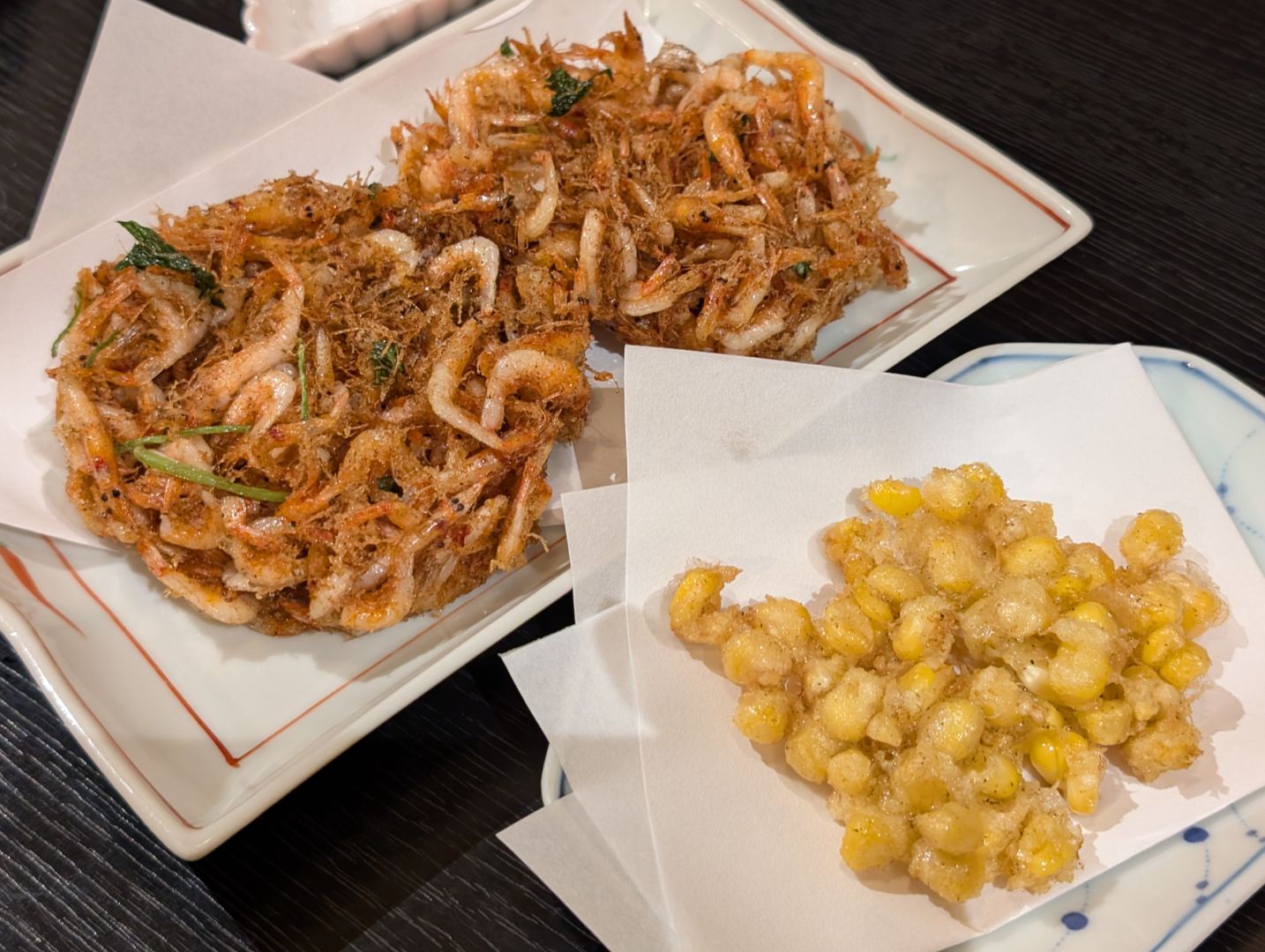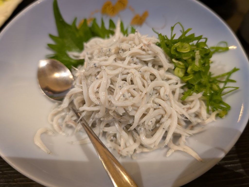 残念ながらこの日は生しらすは無かったので、たっぷりの釜揚げしらすを注文。合わせて、アジのタタキと桜えびのかき揚げを〆に頼みました。釜揚げしらすやアジのタタキの美味しさは言わずもがなだし、おまけのもろこしのかき揚げも甘くて美味しかったのですが、特に驚いたのが桜えびのかき揚げ。かきあげって「パリッ」とか「バリッ」と割と硬めに揚がっていることが多いと思うのですが、驚くほどふんわりと揚がっていて、箸で軽く崩して持ち上げると桜えびの香りがふわーっと広がり、食感も含めて驚くほどの美味しさでした。