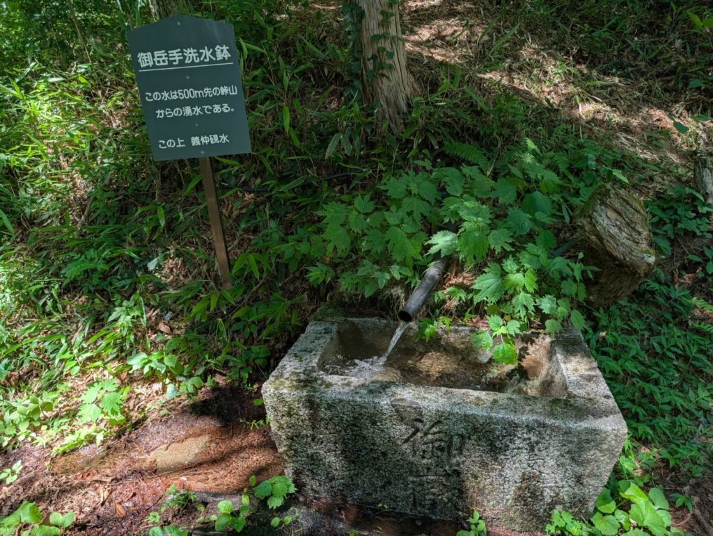御嶽神社のそばにある御岳手洗水鉢、あまりの暑さに体力を奪われていたところで体を冷やすことができて生き返りました。暑い時期の低山登山やハイキングは本当に注意が必要…