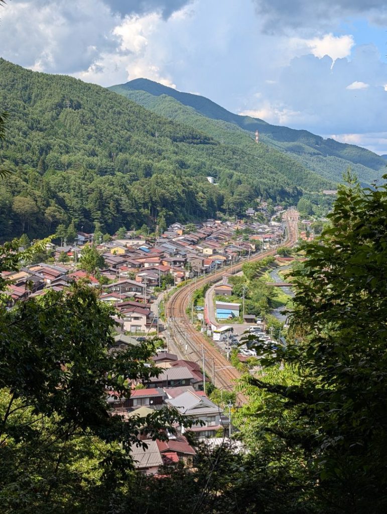藪原宿から奈良井宿へと抜ける道は、あまり眺望の良い場所はないのですが、最初に視界が開ける場所では出発地の藪原宿を一望できました。