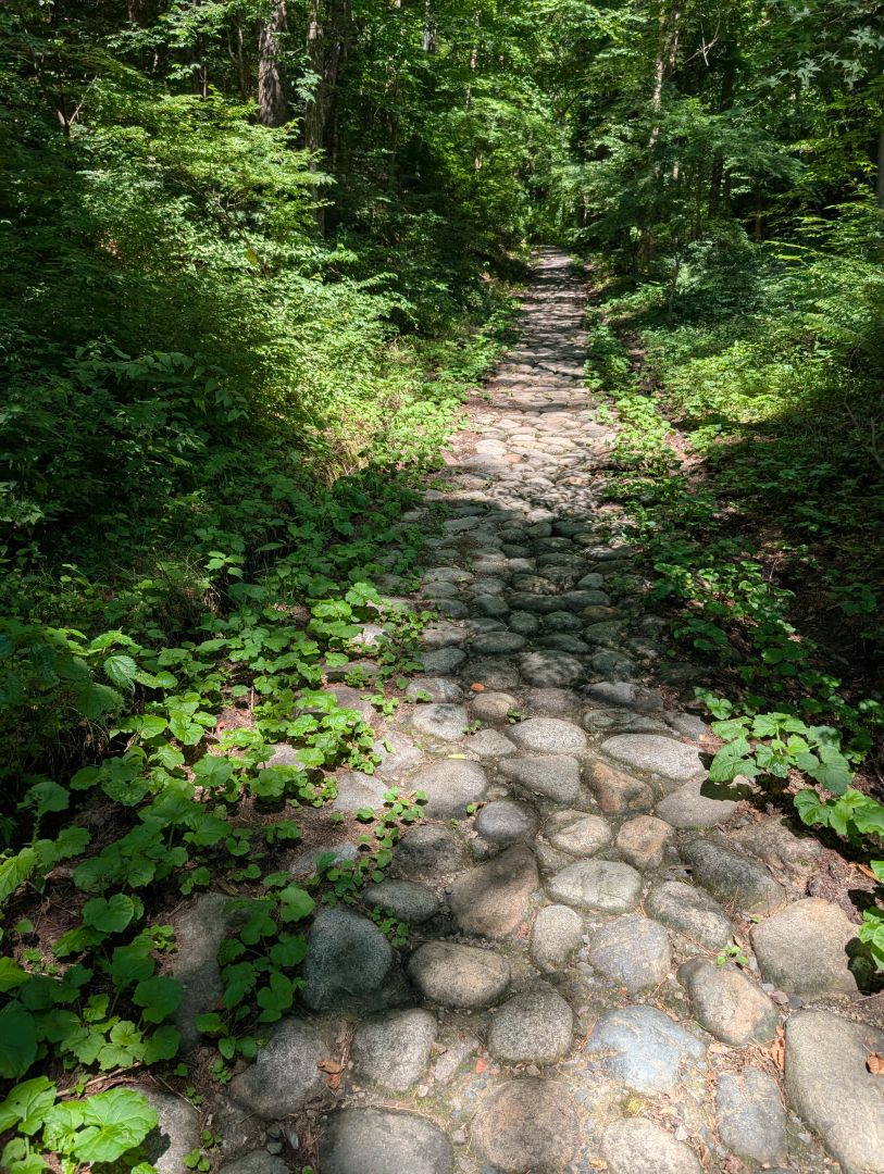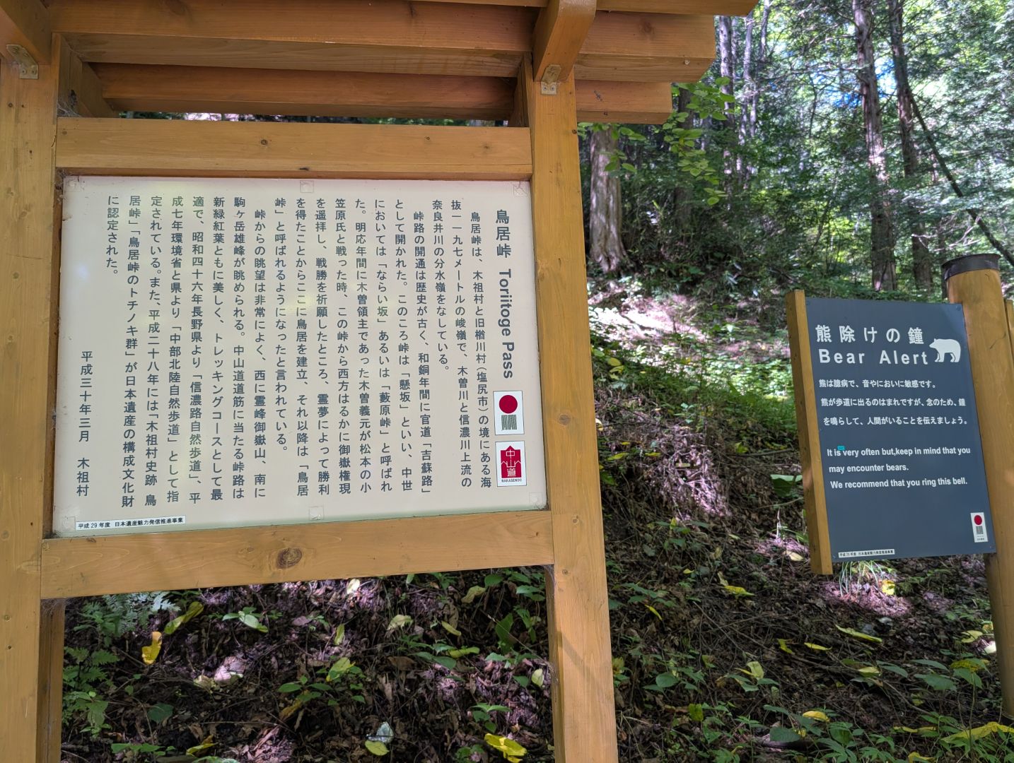 藪原宿から歩くことしばらく、ようやく木々に覆われた山道に入ります。石畳の道が続いていて、街道の歴史を感じます。入口にあった看板には、熊が出ると書いてあってちょっとおっかなビックリ。街道を歩くだけという気持ちだったので、熊鈴は持ち歩いてなかったんですよね…