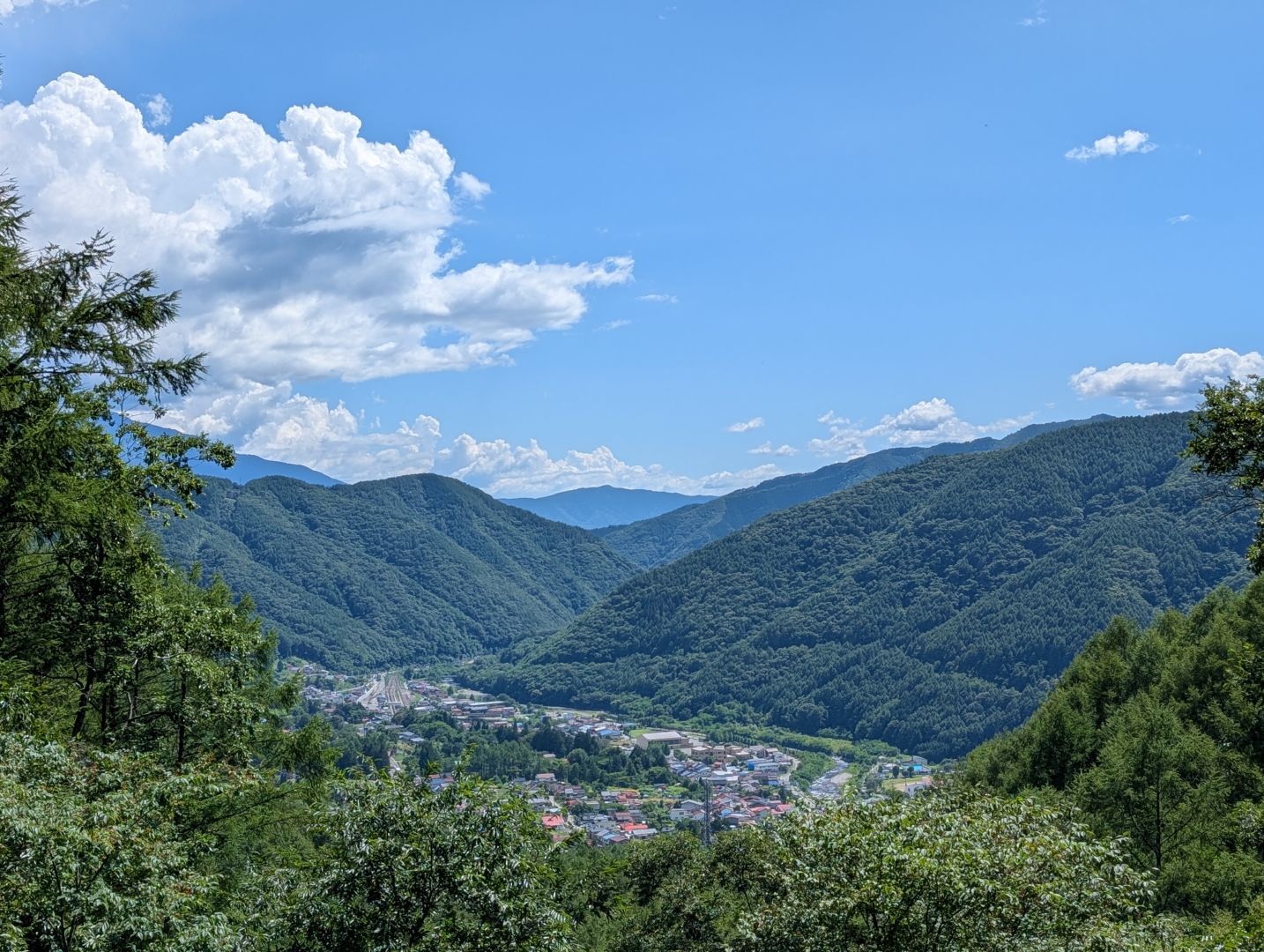 藪原宿から奈良井宿へと抜ける道は、あまり眺望の良い場所はないのですが、最初に視界が開ける場所では出発地の藪原宿を一望できました。