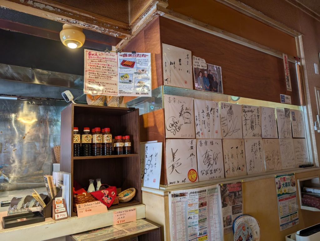 阿寺渓谷からの帰り道、中津川駅の乗り換えで少し時間があったので何か軽くお昼ごはんにと Google Map を眺めていると五平餅の喜楽というお店を駅近に見つけました(駅近だと他に選択肢があまり無い…)。評価がかなり高かったのと、五平餅の定食があるってのにひかれて行ってみました。