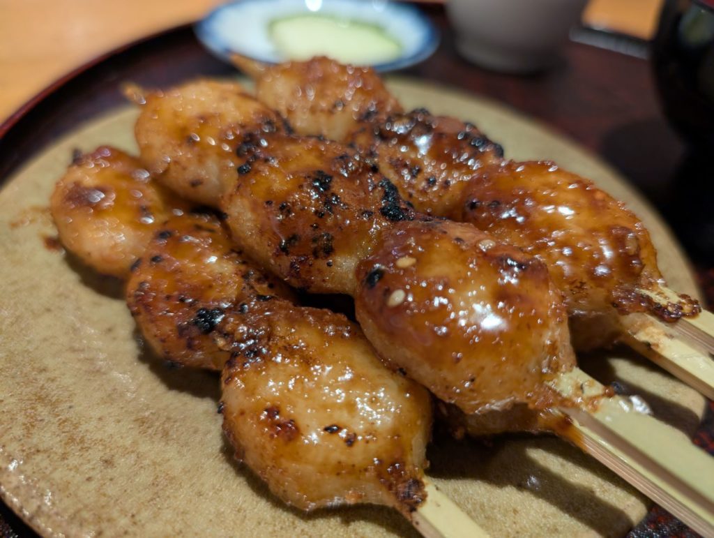 五平餅の定食、5本の五平餅とお吸い物とお漬物がセットになっているのですが、個人的には団子型の五平餅って初めてで、その見た目がみたらし団子みたいなものなので、なんとも不思議な定食っぷりにちょっと驚いてしまいました。