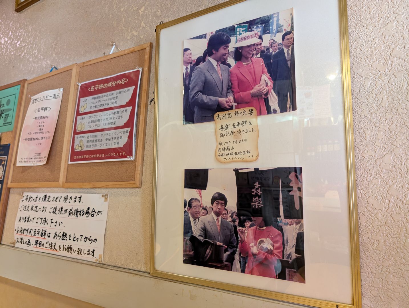 お店はテーブルが2つか3つの小さなお店で、先客は地元の人らしいおじさんたちがテーブルの1つを占めていて、何か地元の工事に関わる話で随分と盛り上がっていました。店舗の外に直接つながっていてテイクアウトに対応できる場所で五平餅を焼いていて、店内にも香ばしい香りが漂っていました。