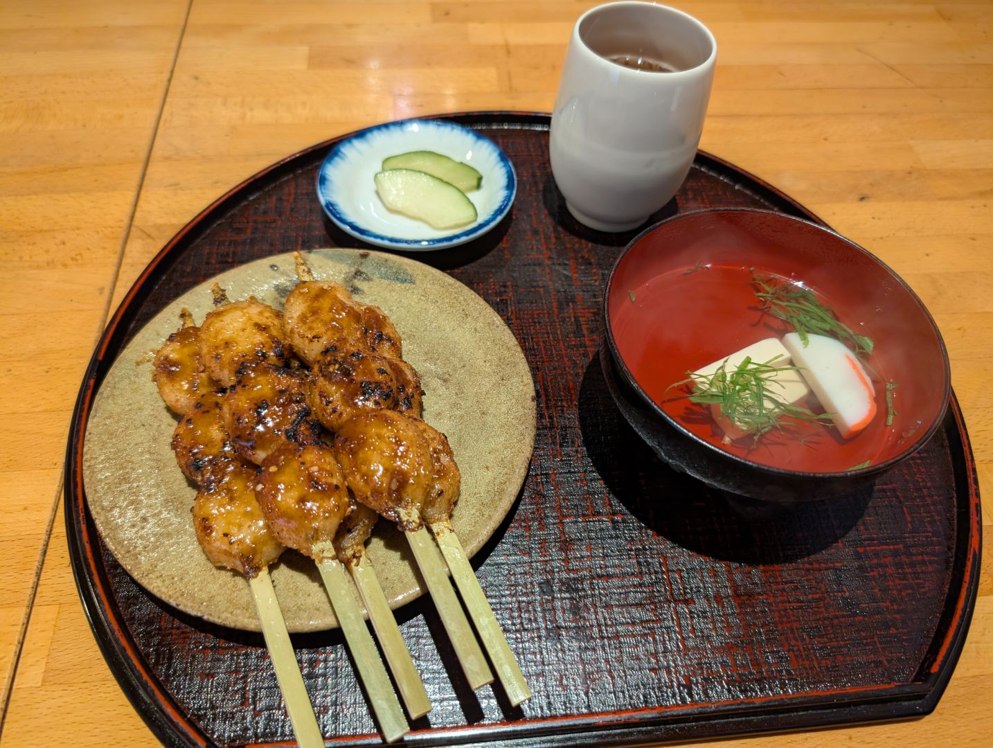 五平餅の定食、5本の五平餅とお吸い物とお漬物がセットになっているのですが、個人的には団子型の五平餅って初めてで、その見た目がみたらし団子みたいなものなので、なんとも不思議な定食っぷりにちょっと驚いてしまいました。