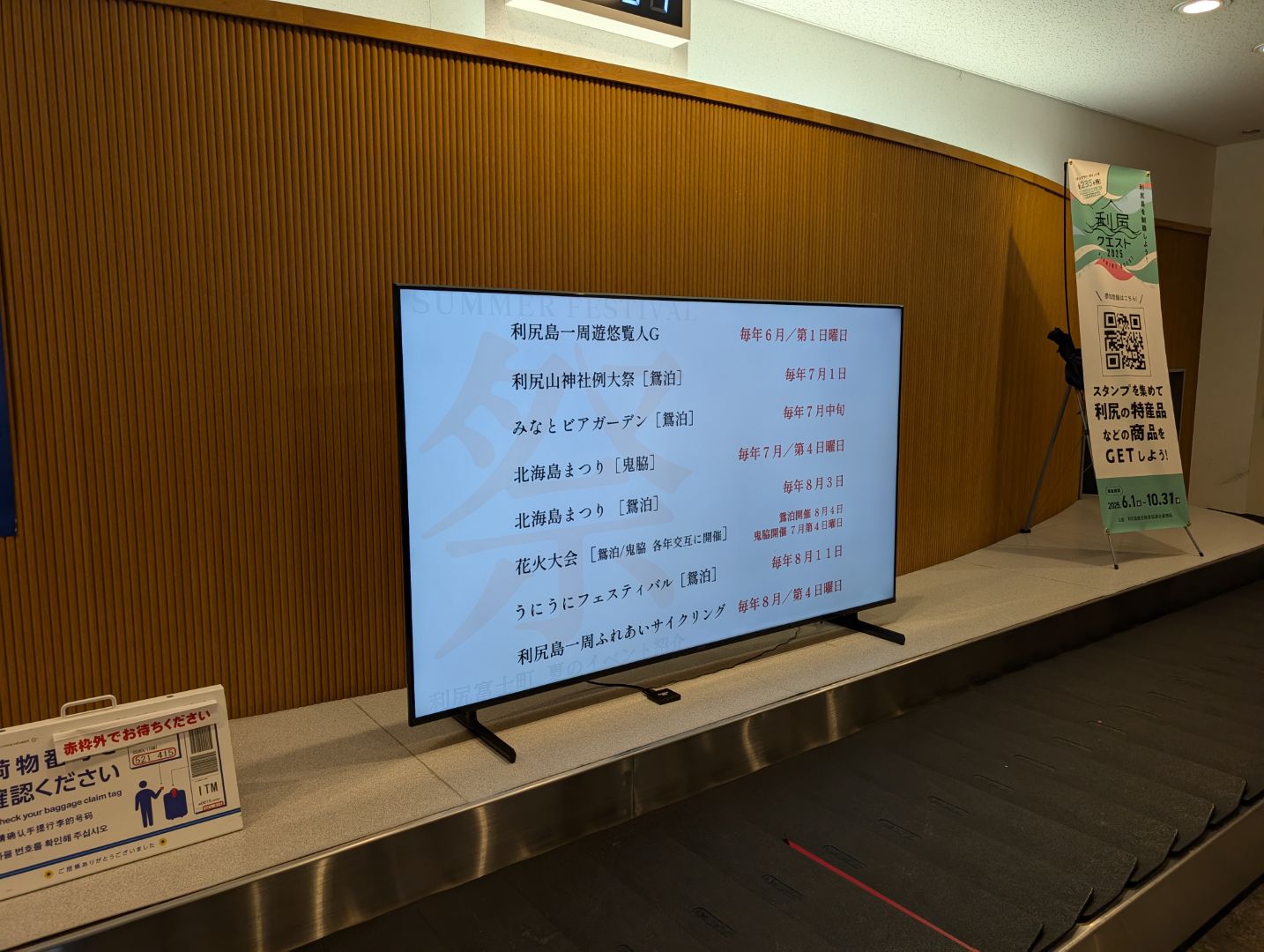 利尻空港の小さな手荷物受け取り所に置かれた大きな液晶テレビに表示されていた「祭り」の案内。何より気になったのは、滞在中の 8月11日に開かれる「うにうにフェスティバル」。気になって調べてみると、ウニの早食い大会があり、飲食コーナーでは「焼きウニ」や「ミニうに丼」などでウニをお腹いっぱい食べられるとのこと。ウニ以外にも利尻ならではの新鮮な海産物たちが屋台ブースに勢揃い…ってこれは最高なのでは…