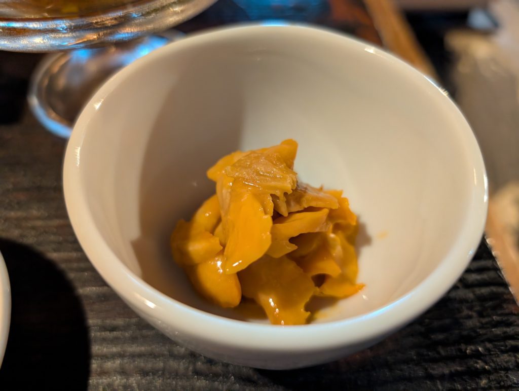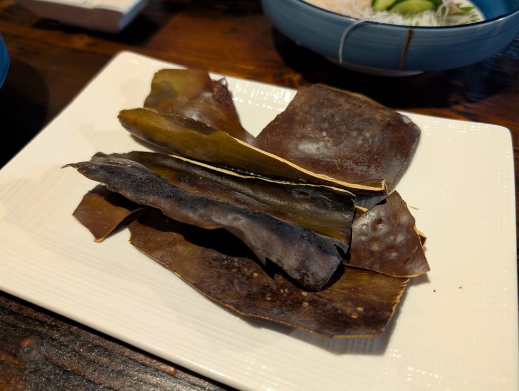 最初に出していただいたのは、つぶうに和え、めかぶの酢の物、利尻昆布の炭焼き。どれもお酒のあてにピッタリ。めかぶの酢の物は、めかぶが細かくみじん切りのようにされていて、コリコリとした食感も味付けもちょっとこれまで食べたことが無いものでした。また、利尻昆布の炭焼きも、とても分厚い昆布でバリバリとおせんべいのような食感で、これも初体験。