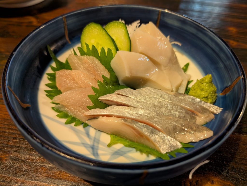 お刺身の盛り合わせは、利尻島ならではのものでした。手前はあぶらにしん、左側はほっけ、奥はたこのかしら。あぶらにしんはその名の通り脂が乗ったニシン、独特な歯ごたえを感じた後に脂の甘味が口に広がり美味、多分これも初めて食べた気がします。ほっけの刺し身は水分が多いためか柔らかな歯ごたえで、わりとあっさりとした味でした。これも初めて食べましたが、個人的には干物で焼いたほうが好きかな。たこのかしらは、独特の弾力と旨味があってこれはなかなかの美味。