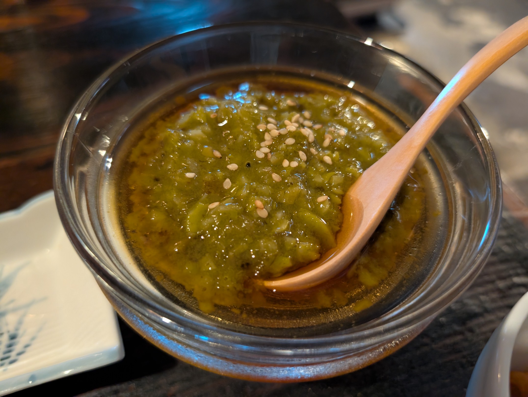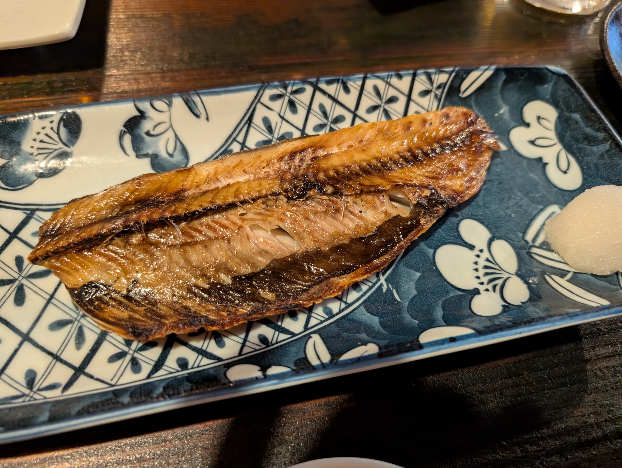 あまりの美味しさに、みなパクパクあっという間に平らげていったので、焼き物は最後に出てきて食べることに。焼き物はホッケとあぶらにしんを選べたのですが、食べたことがなかったこともあってあぶらにしんの焼き物を頼んでみました。焼くと脂がそこそこ落ちるのか、こちらはわりとあっさり。とはいえ、ニシンの塩焼きとはだいぶイメージの違う仕上がりでした。