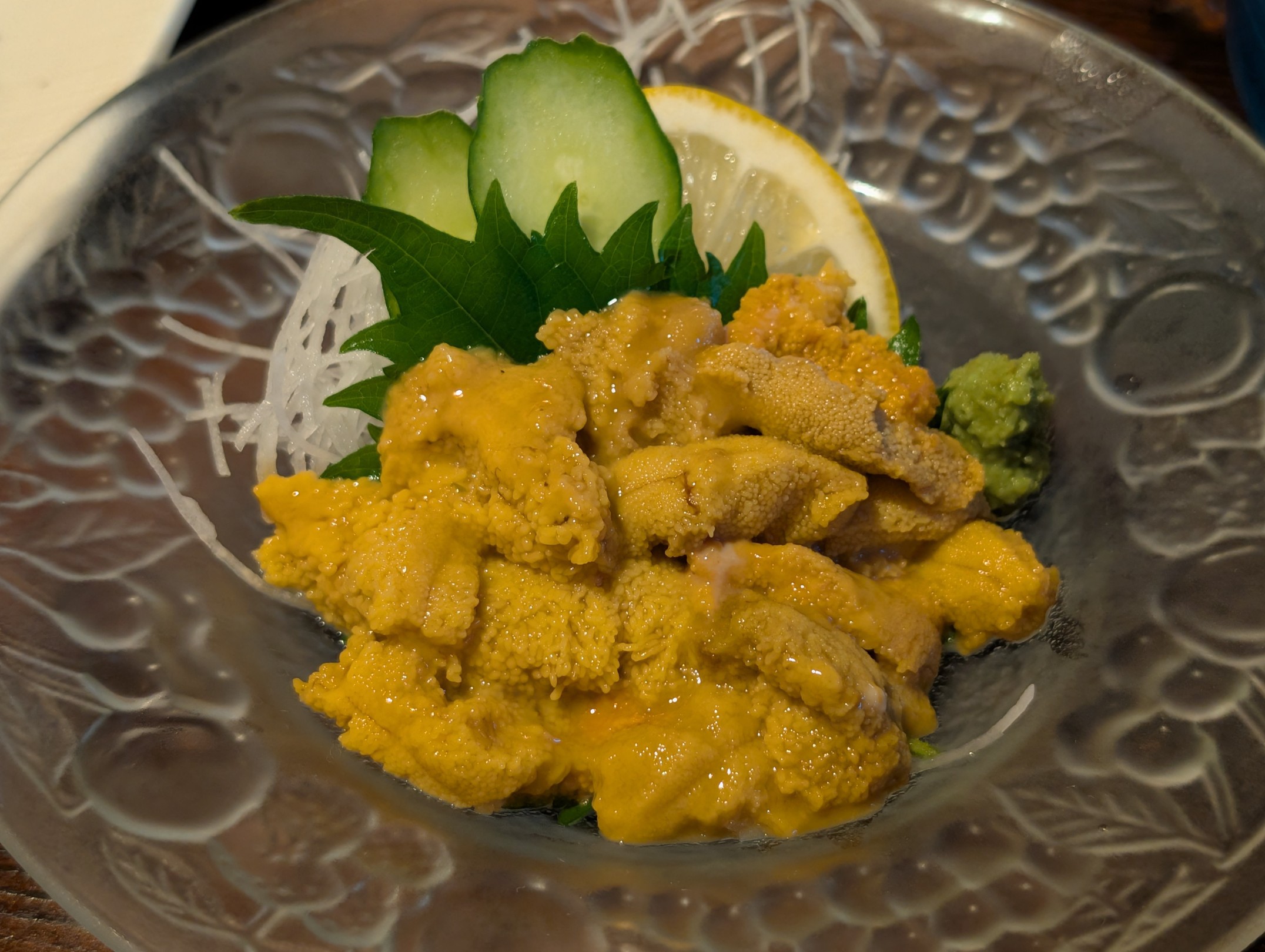 驚いたのがウニ刺し、これ一人前です。コースの差額が1000円で、それがこのウニ刺しの分とのことなので、破格な気がします。たっぷりのキタムラサキウニの刺し身、飽きるほど食べることができて幸せ。