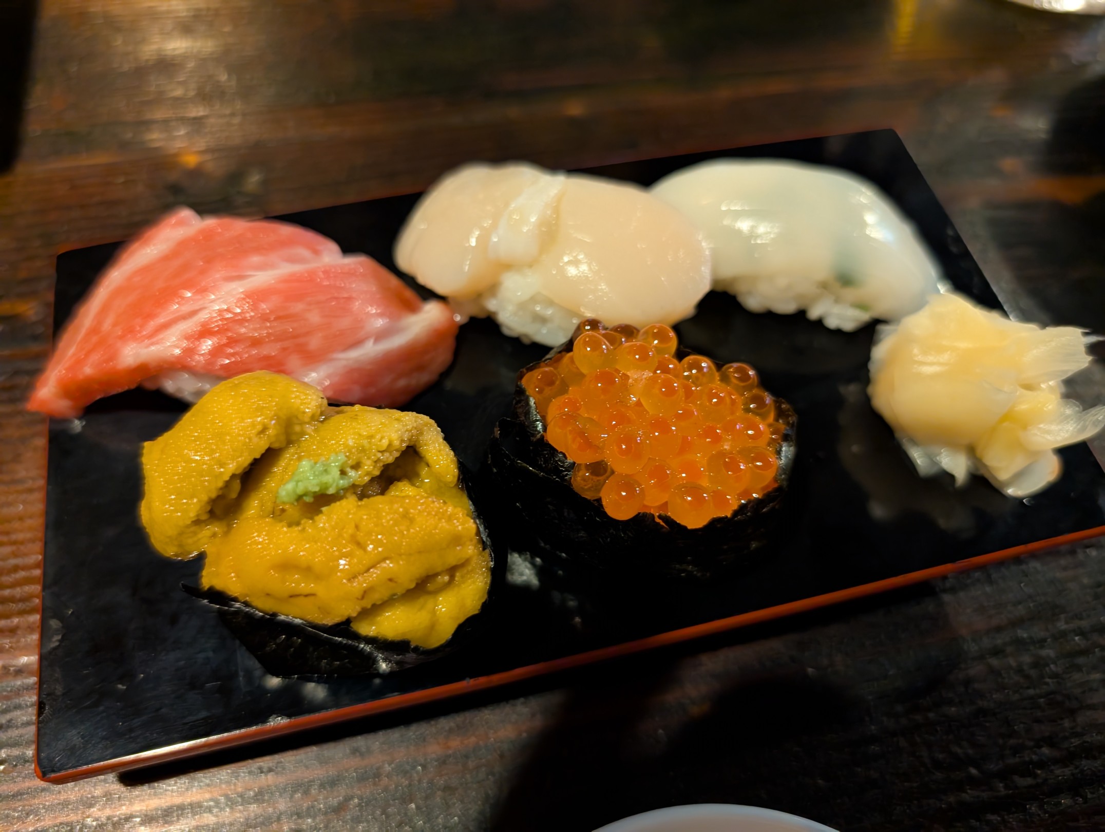 さらにお鮨もなかなか本格的で、ここにもウニが。イカとウニが利尻産だって言っていたかな。どのネタも最高に美味しかった。