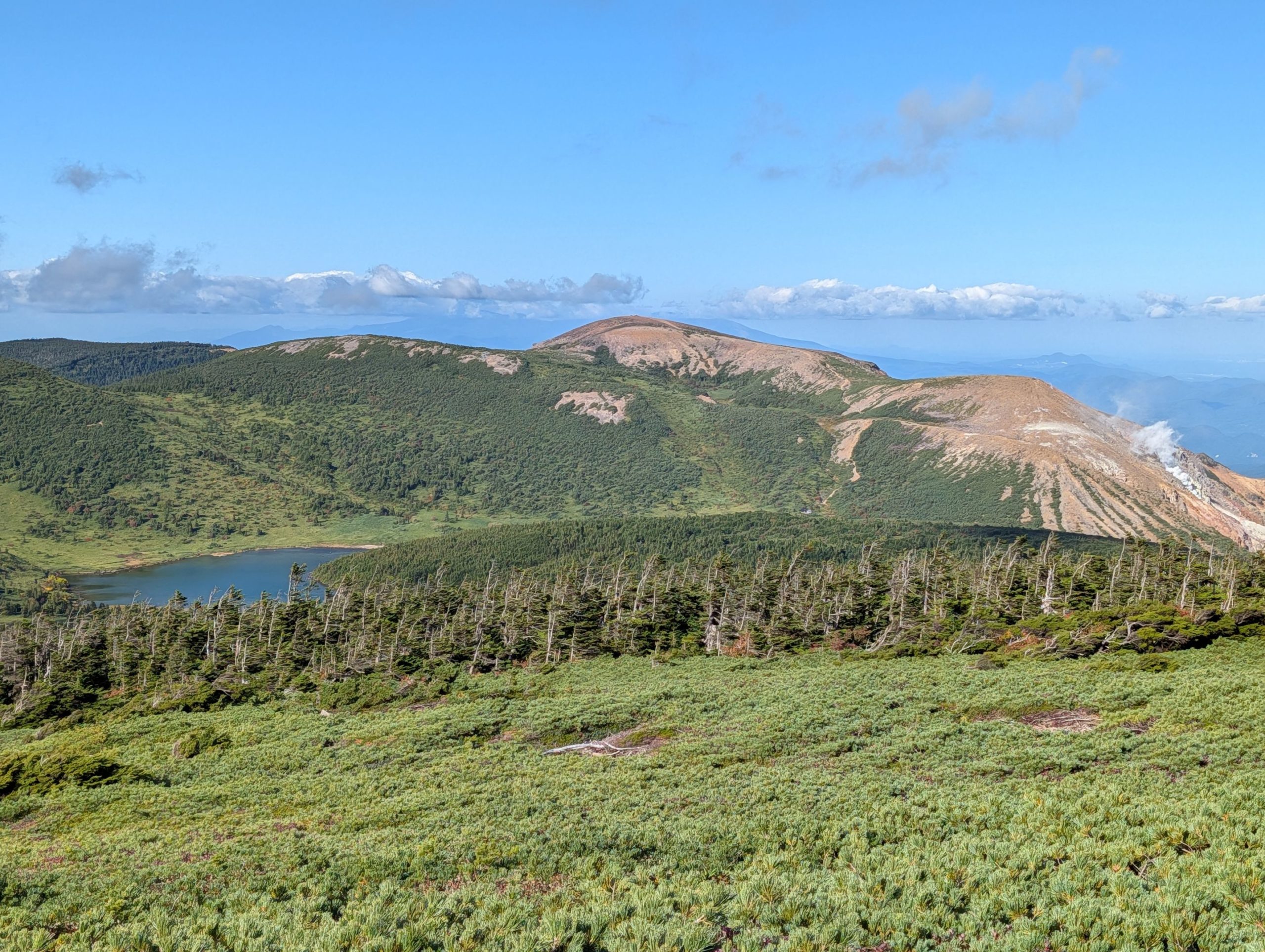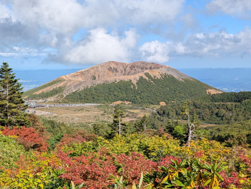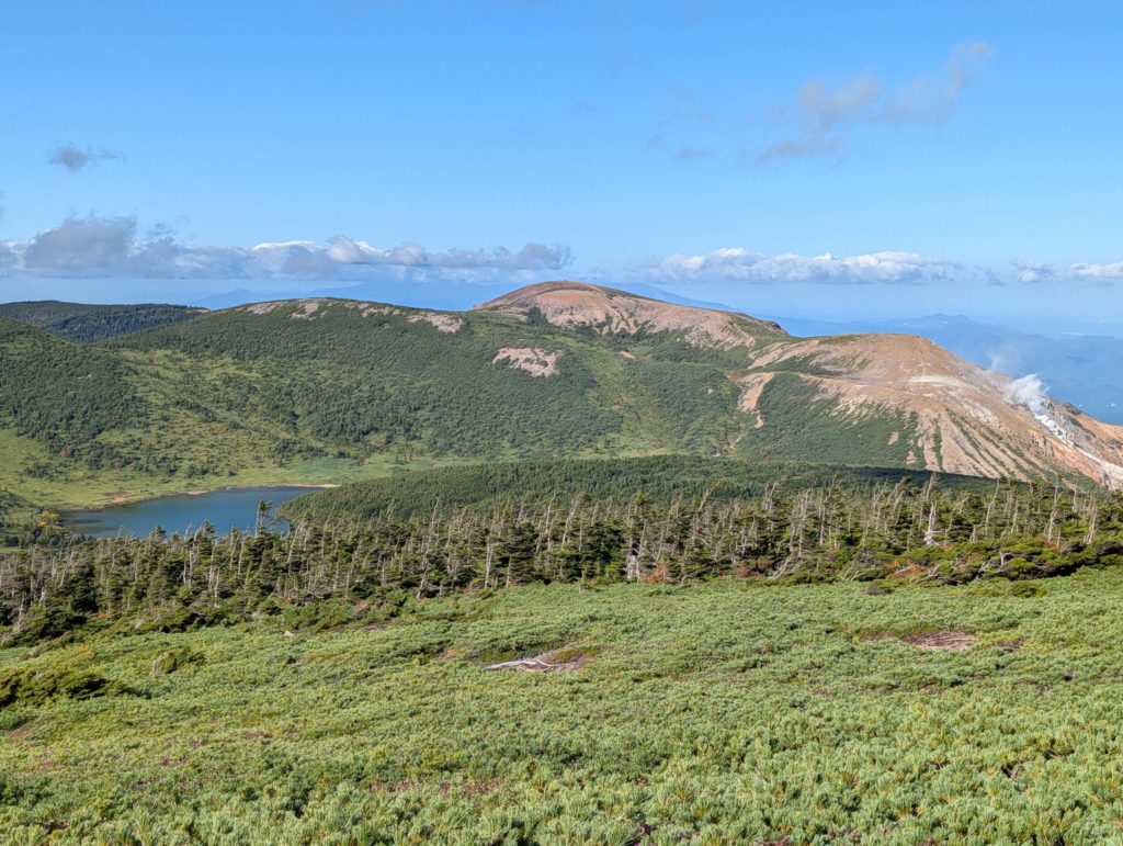 山頂付近からは360度の大パノラマを楽しむことができ、噴煙を上げる山や、浄土平、これから向かう鎌沼などが見渡せます。もう少し秋が深まると、おそらく更に黄色や赤い色に覆われて本当に美しい景色が楽しめそうです。