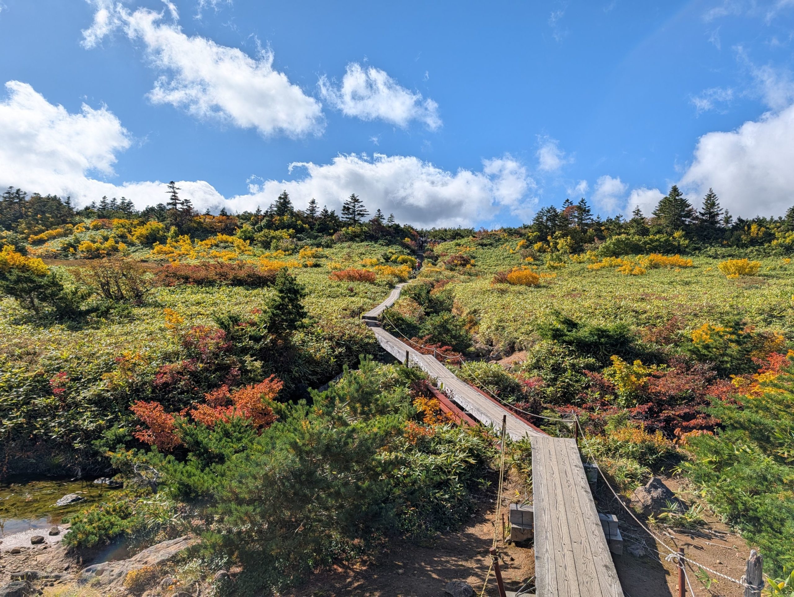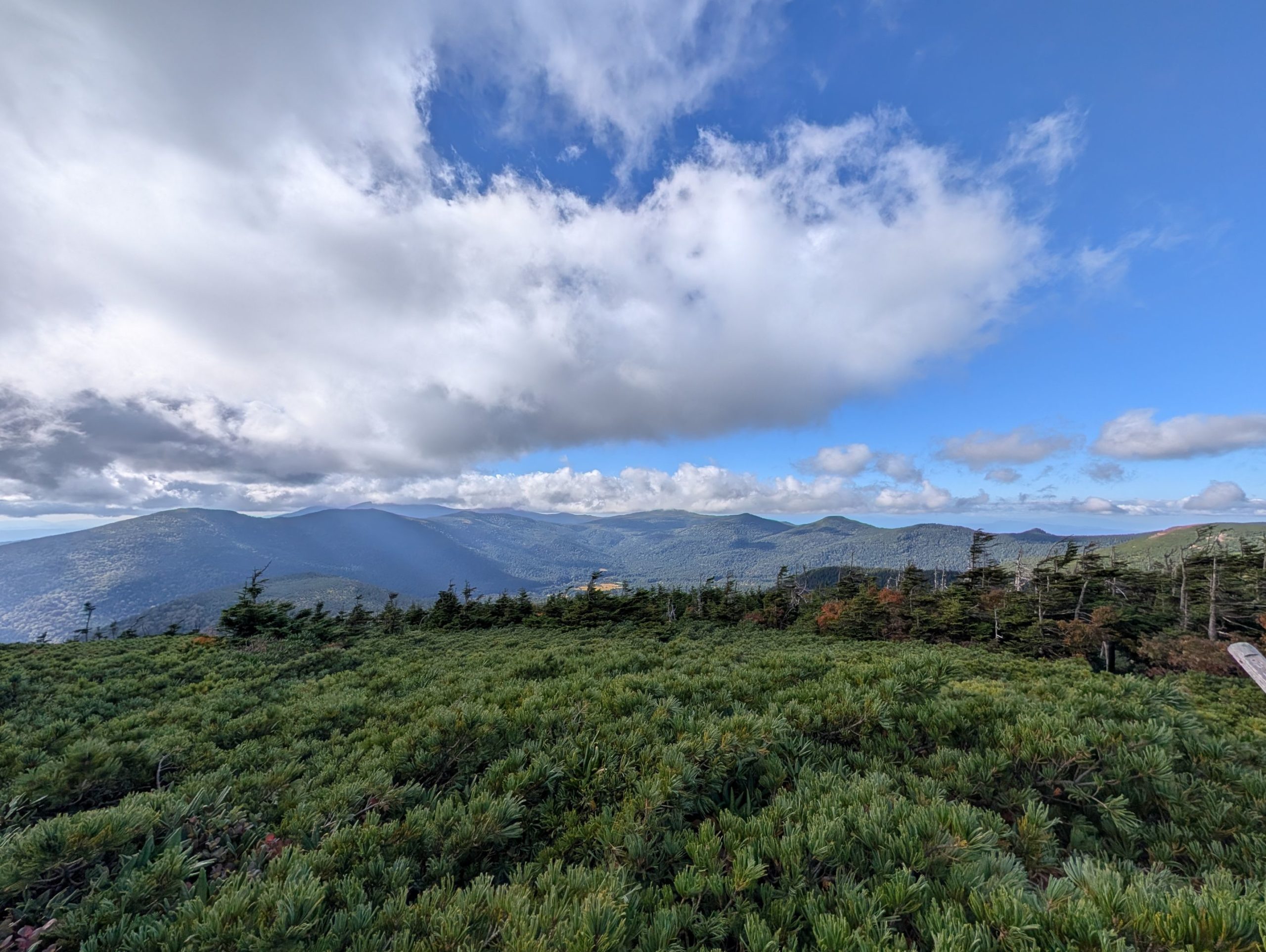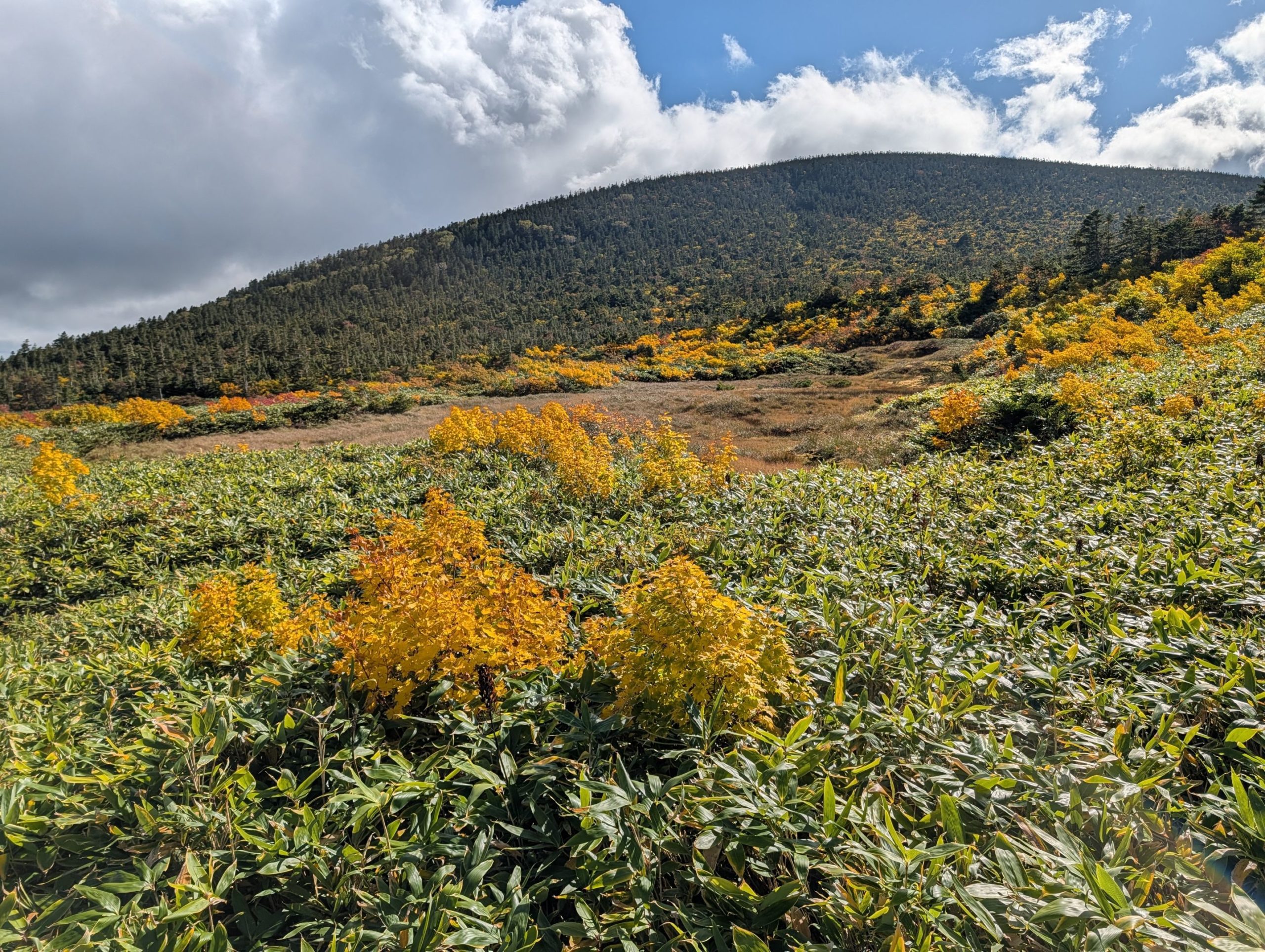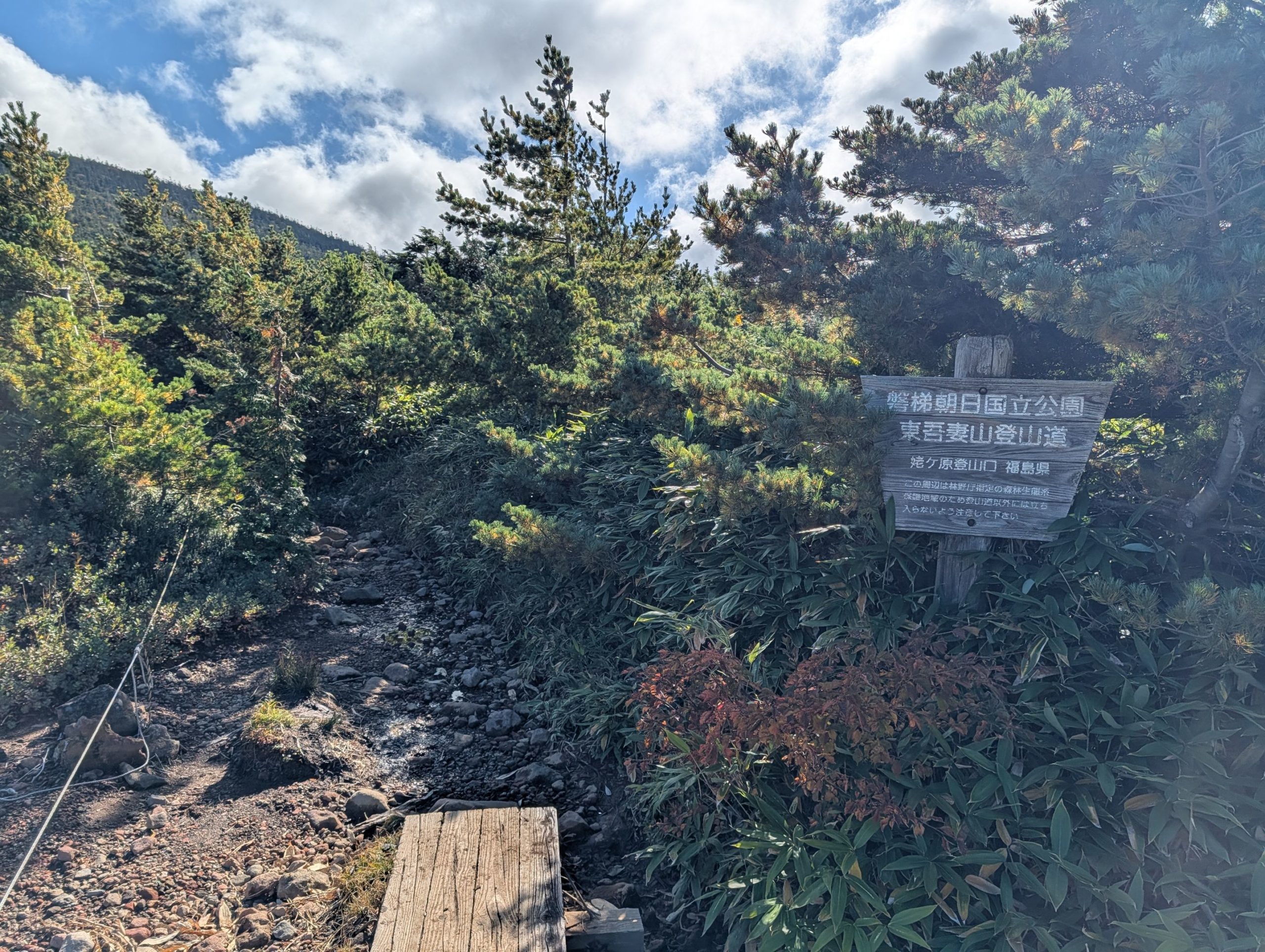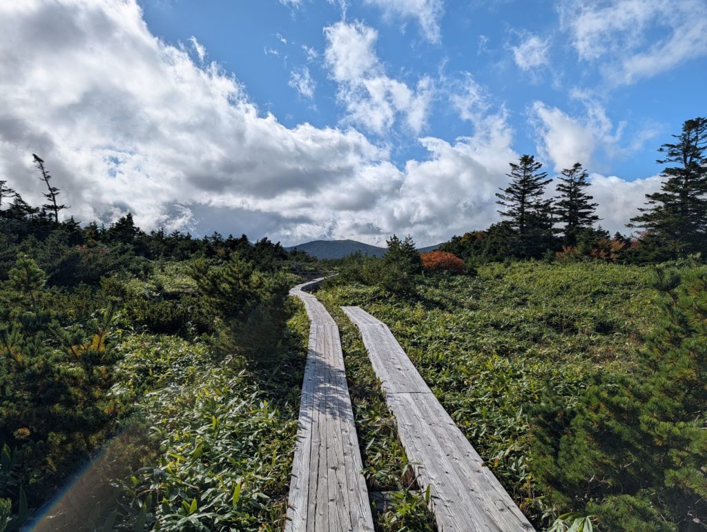 登山口を中々見つけられず、浄土平の湿原の木道をしばらくウロウロした後、ようやく見つけ出して出発。浄土平が既に標高 1600メートルの地点にあることもあり、標高 1975メートルの東吾妻山への登山は比較的なだらかで楽な登山。赤色や黄色に紅葉が始まっている一方で、まだ濃い緑もに残っていてまさに錦繍という感じで非常に綺麗でした。また時間も時間だったせいか、登る人は皆無、下山してくる人もほとんどおらず静かな山行を楽しめました。