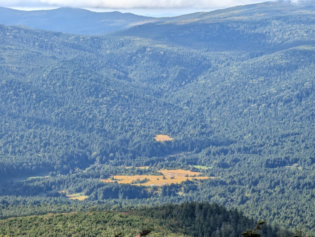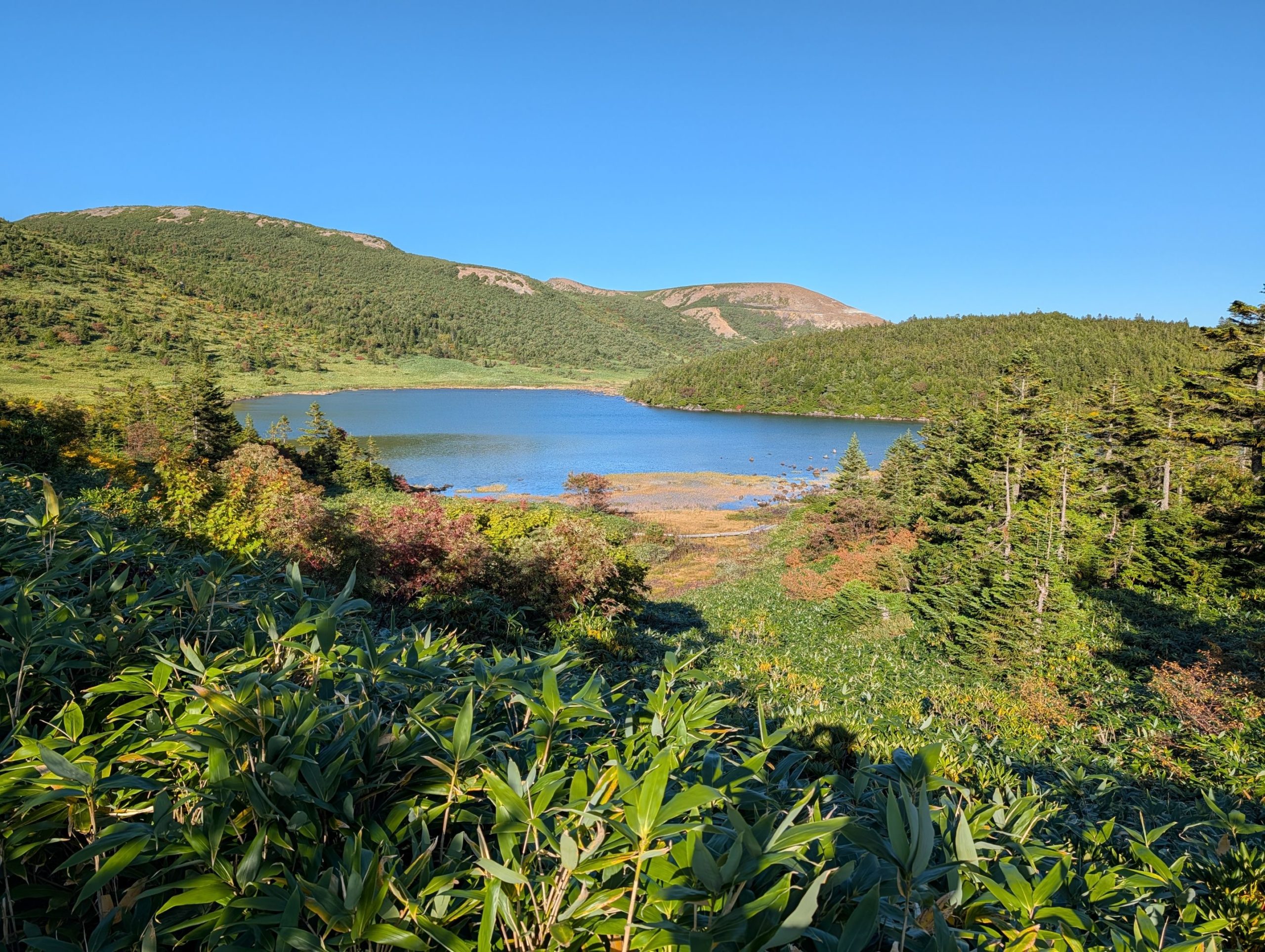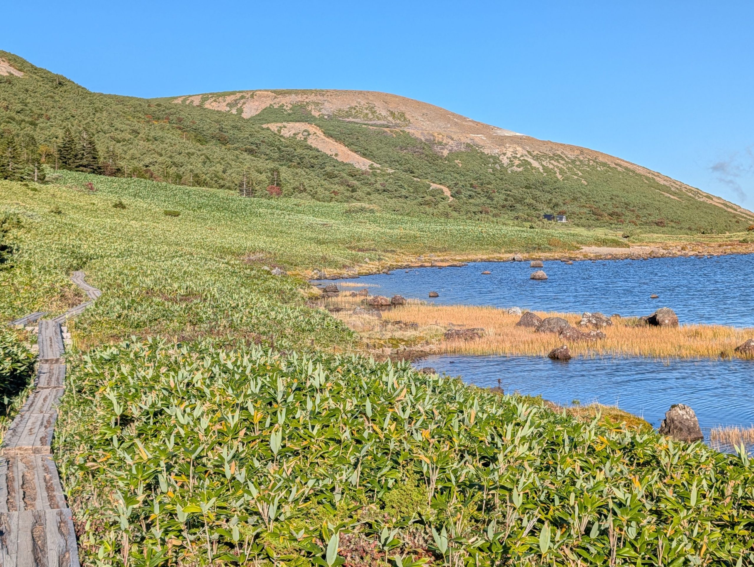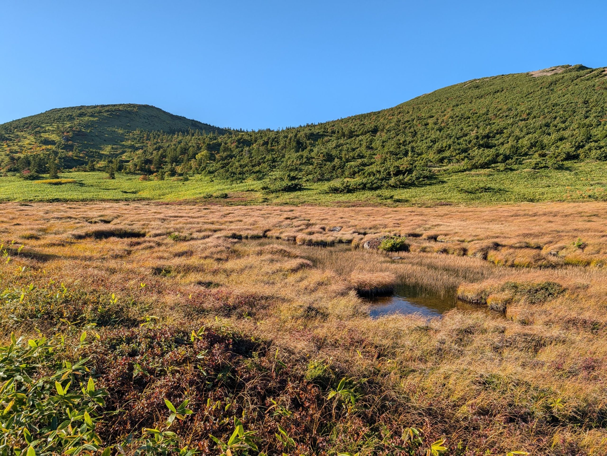 頂上からの大パノラマも素晴らしかったのですが、思わずゾクッとするほど美しいと思ったのが鎌沼でした。午後5時前で太陽が傾き、色が黄色く変わった湿原の草が黄金色になり、沼は風も無く鏡のように周りの景色を写し込んでいました。人が誰もおらず、夕陽が沈むまでここでゆっくりと眺めていたいという衝動に駆られました。