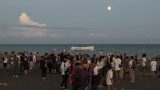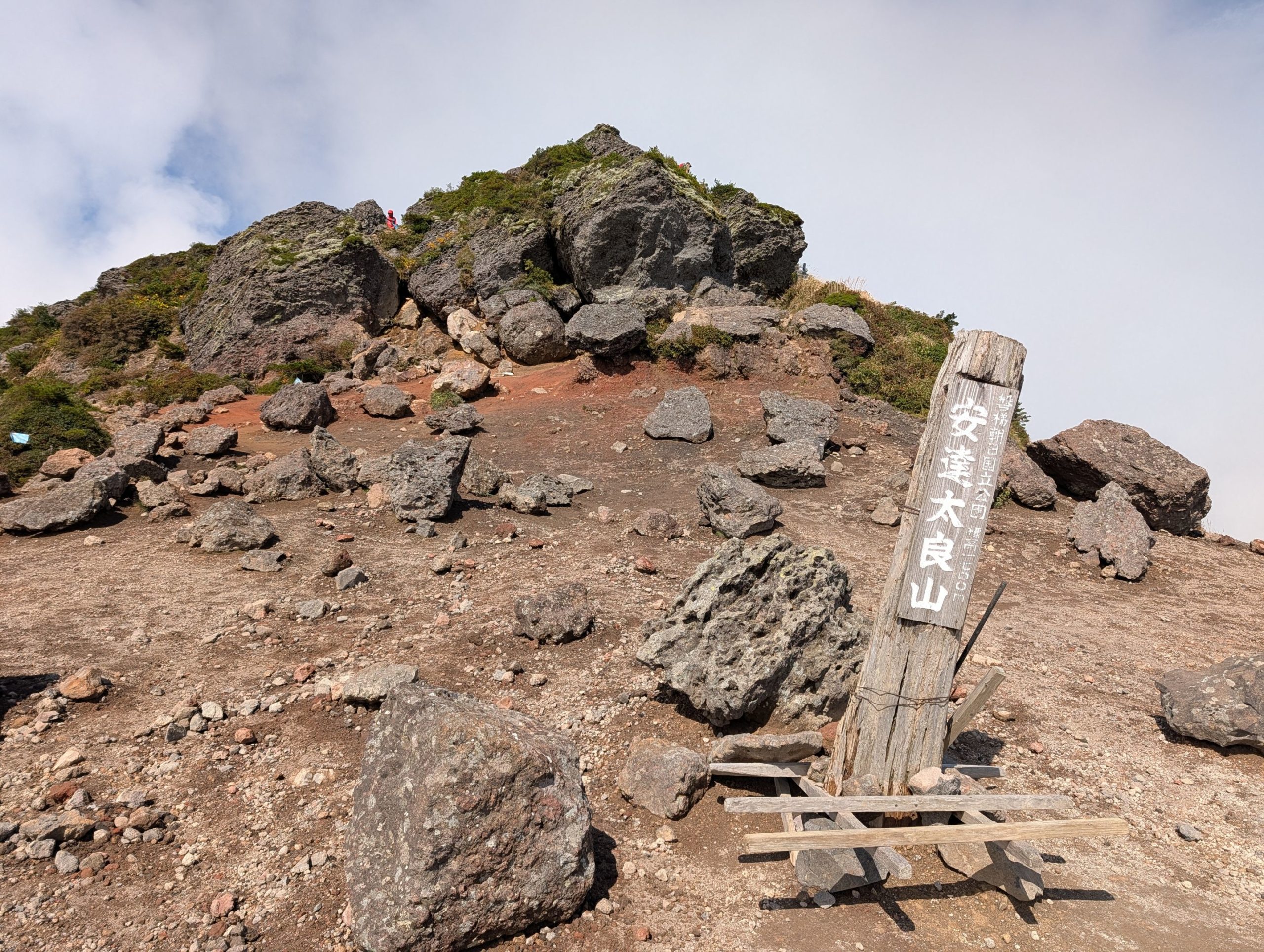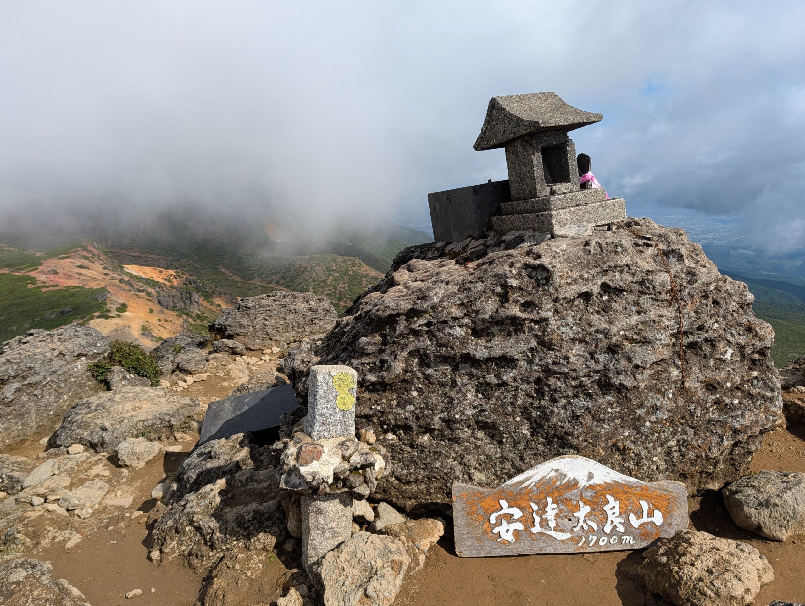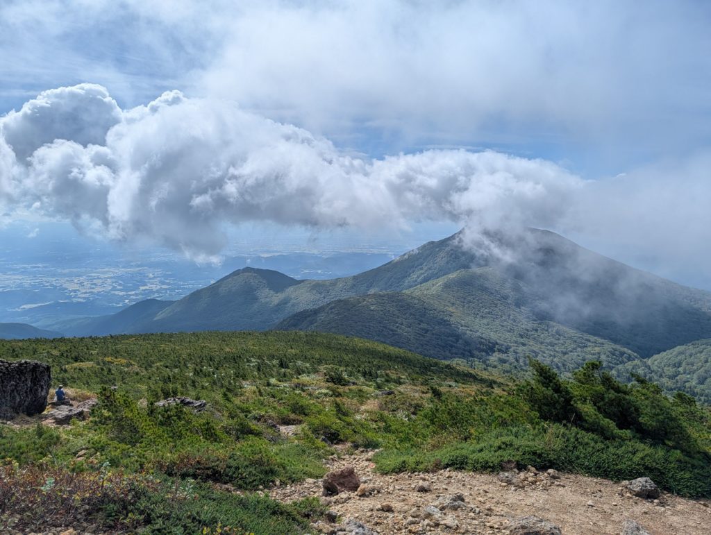 安達太良山山頂に到着、先程までの猛烈な風が嘘みたいな状態。というかロープウェイ側から軽装で上ってきている人たちの様子を見る限り、どうやら猛烈な風が吹き荒れていたのは蜂の辻あたりだけだったのかも。山頂ははしごを登り、ちょっとした岩を登る必要があるので、そこまで登る人もいれば、その下に設置された山頂標識で記念撮影をしている人もいました。こちらは風も無く、穏やかな日差しがあり、お腹も空いたのでおにぎりやお菓子を食べてのんびりと眼前に広がる雄大な景色を楽しみました。