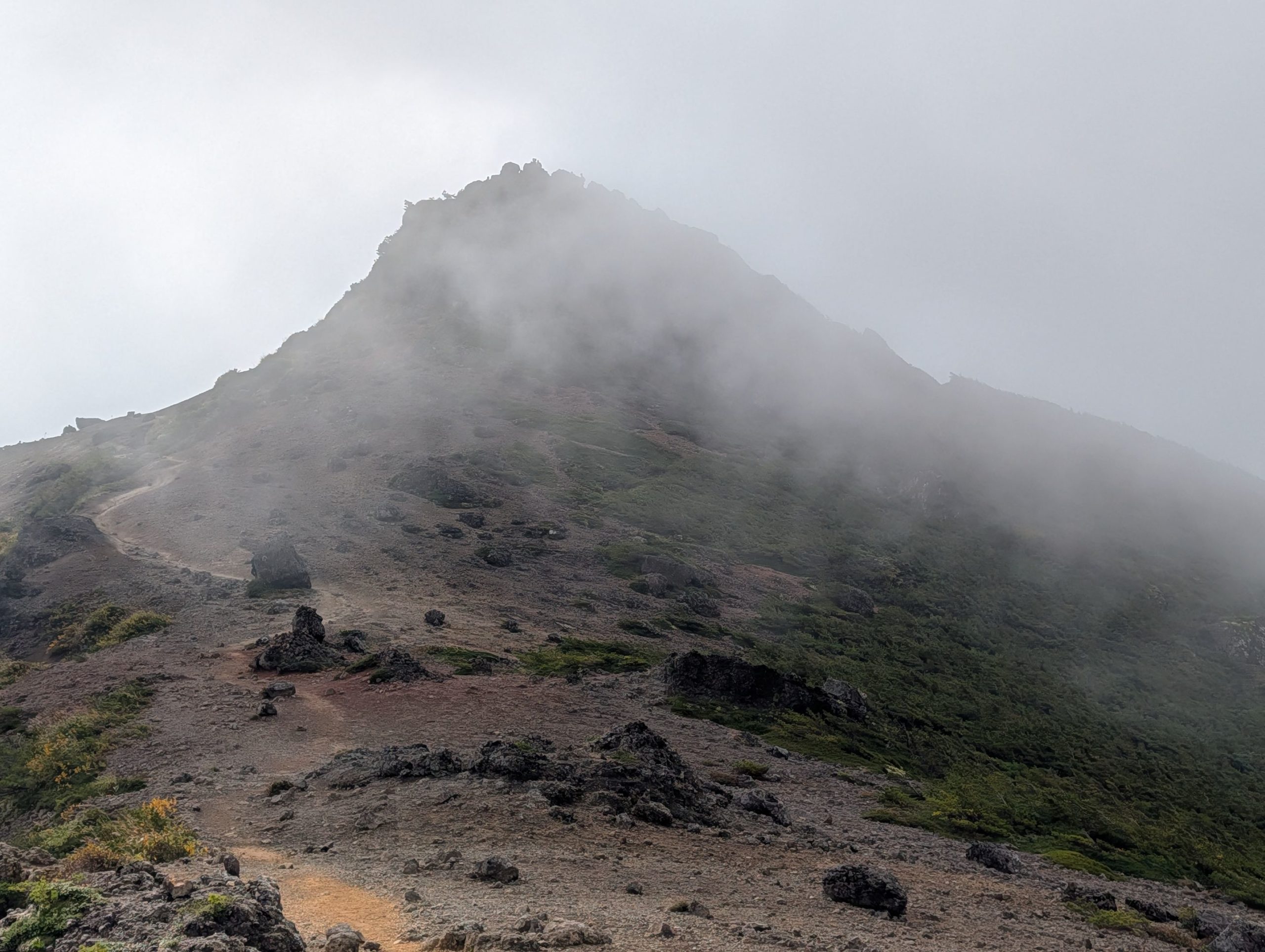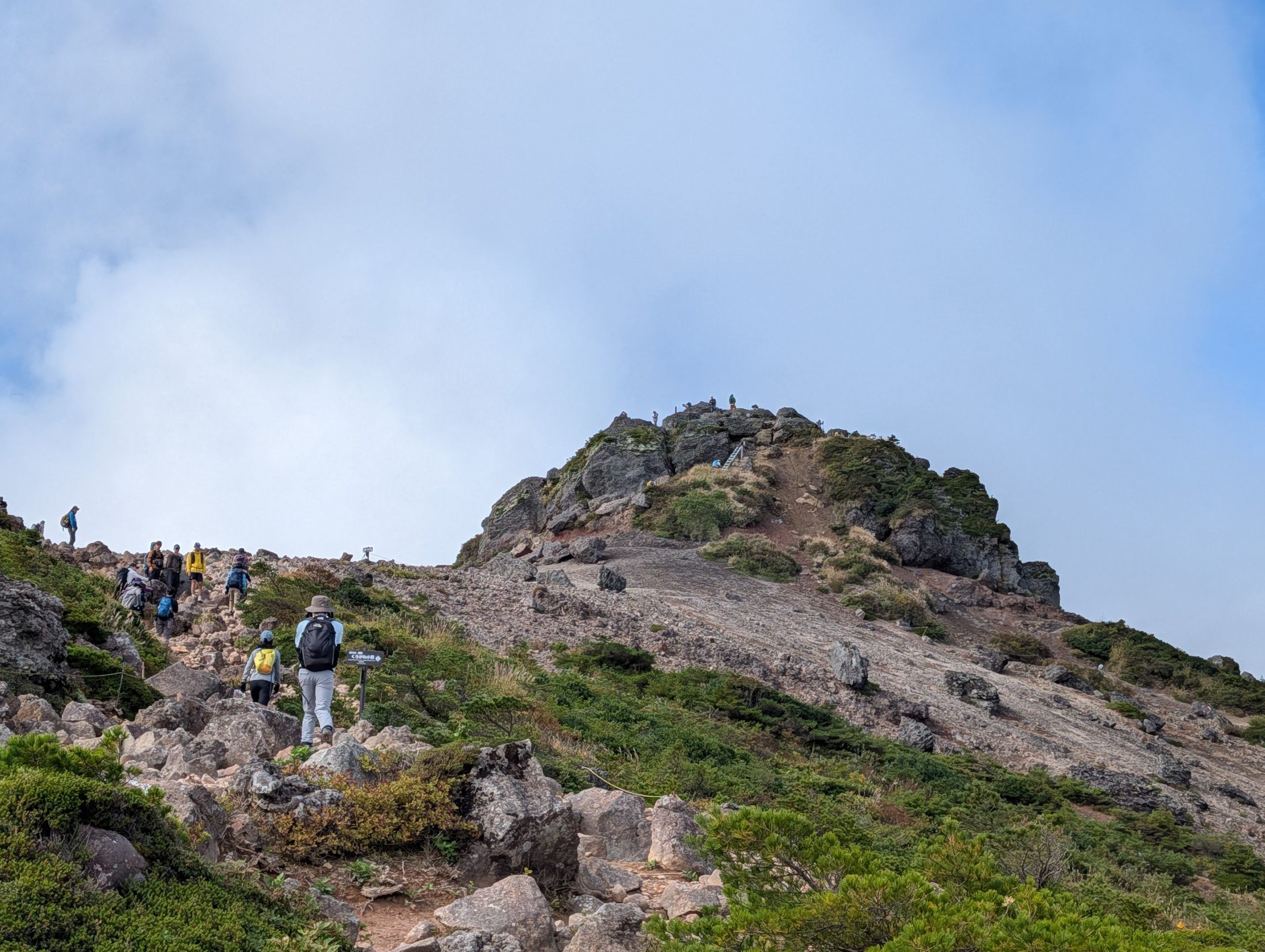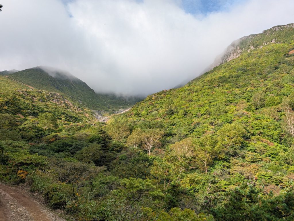 くろがね小屋をすぎると、また本格的な登りに。このあたりからは低木しか無く振り返るといい感じに景色が広がります。一方で、目の前はだいぶ雲で覆われてかなり怪しい感じに。