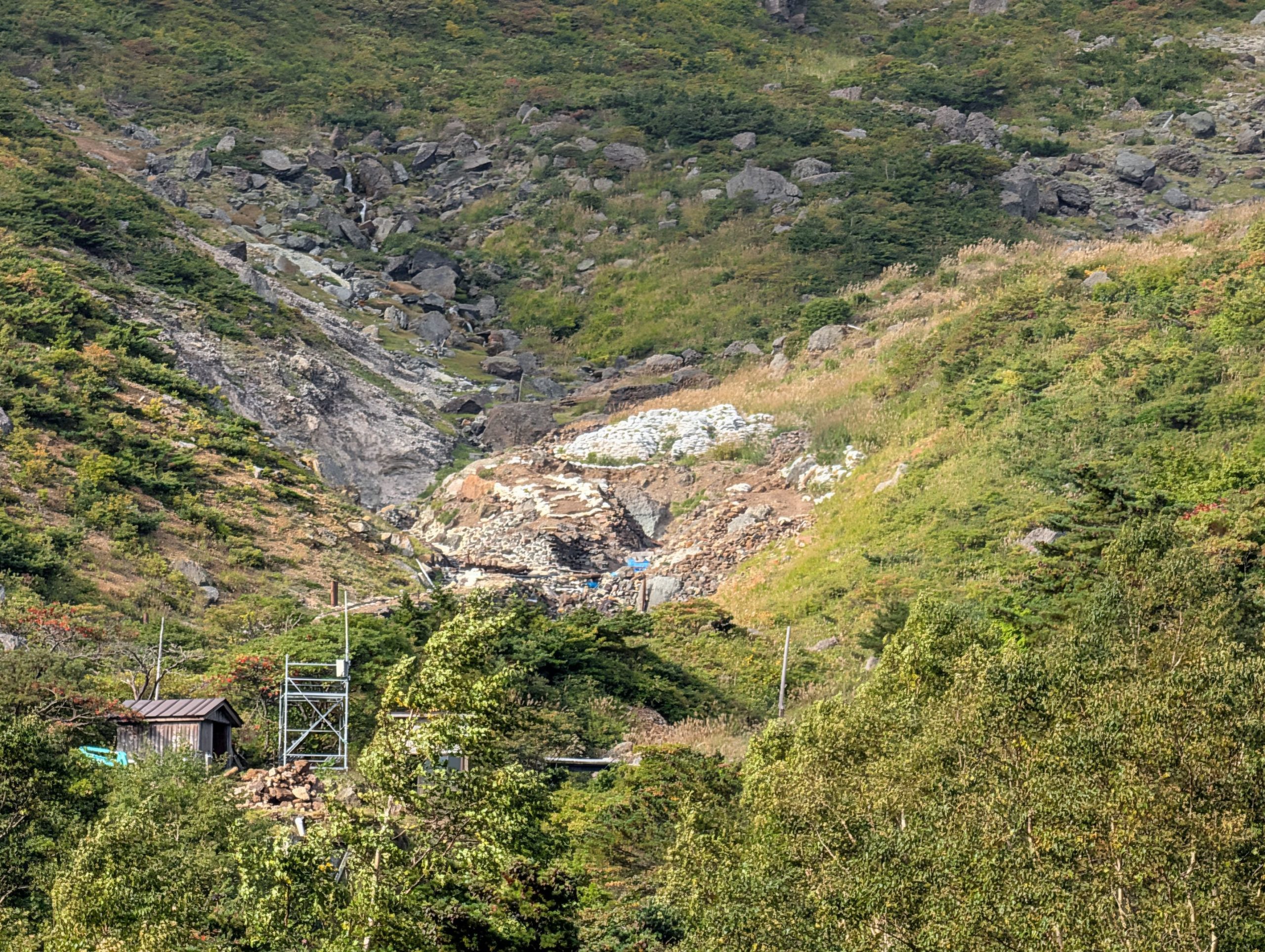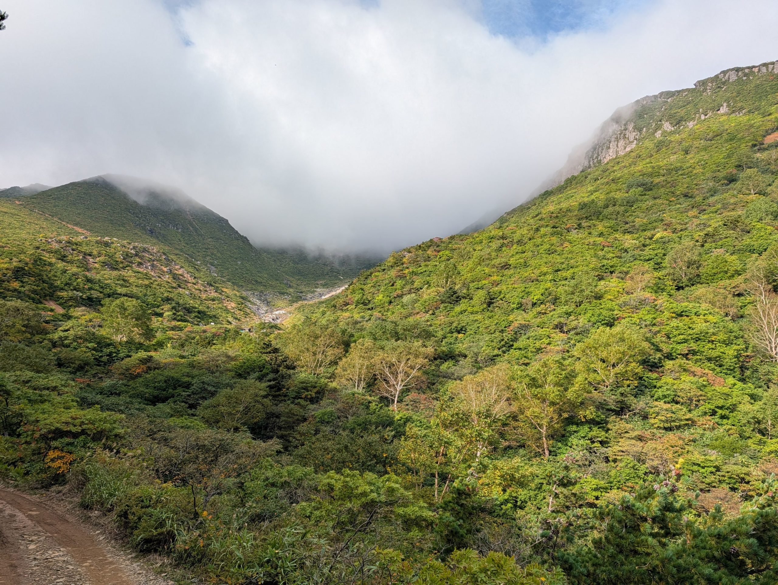 勢至平の平坦な道を暫く歩くと、あたりに硫黄の香りが漂い始めます。楽しみにしていた、くろがね小屋と思われる場所も見えてきて、温泉が楽しみです。