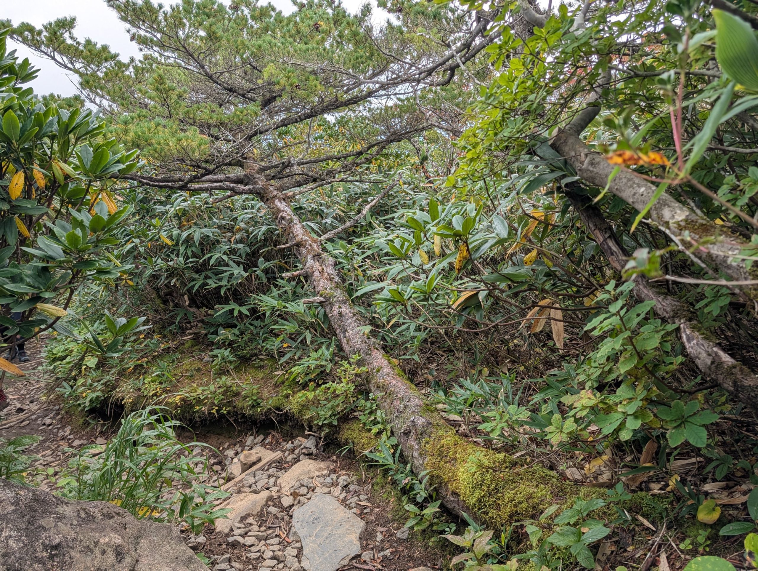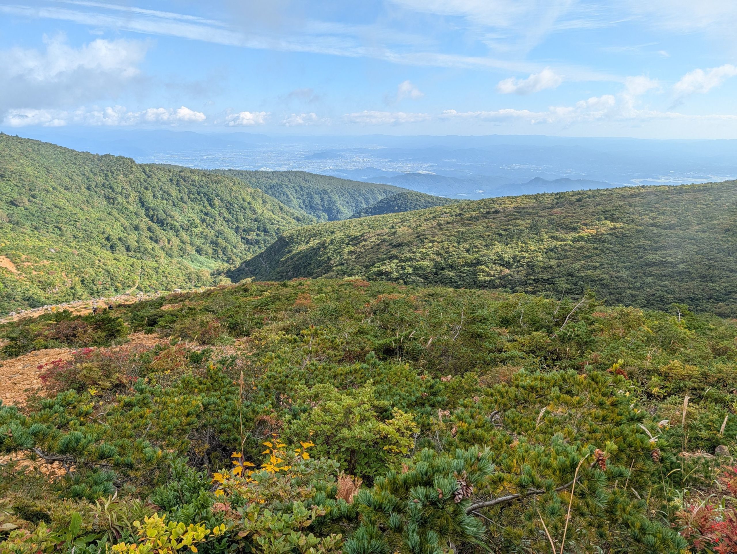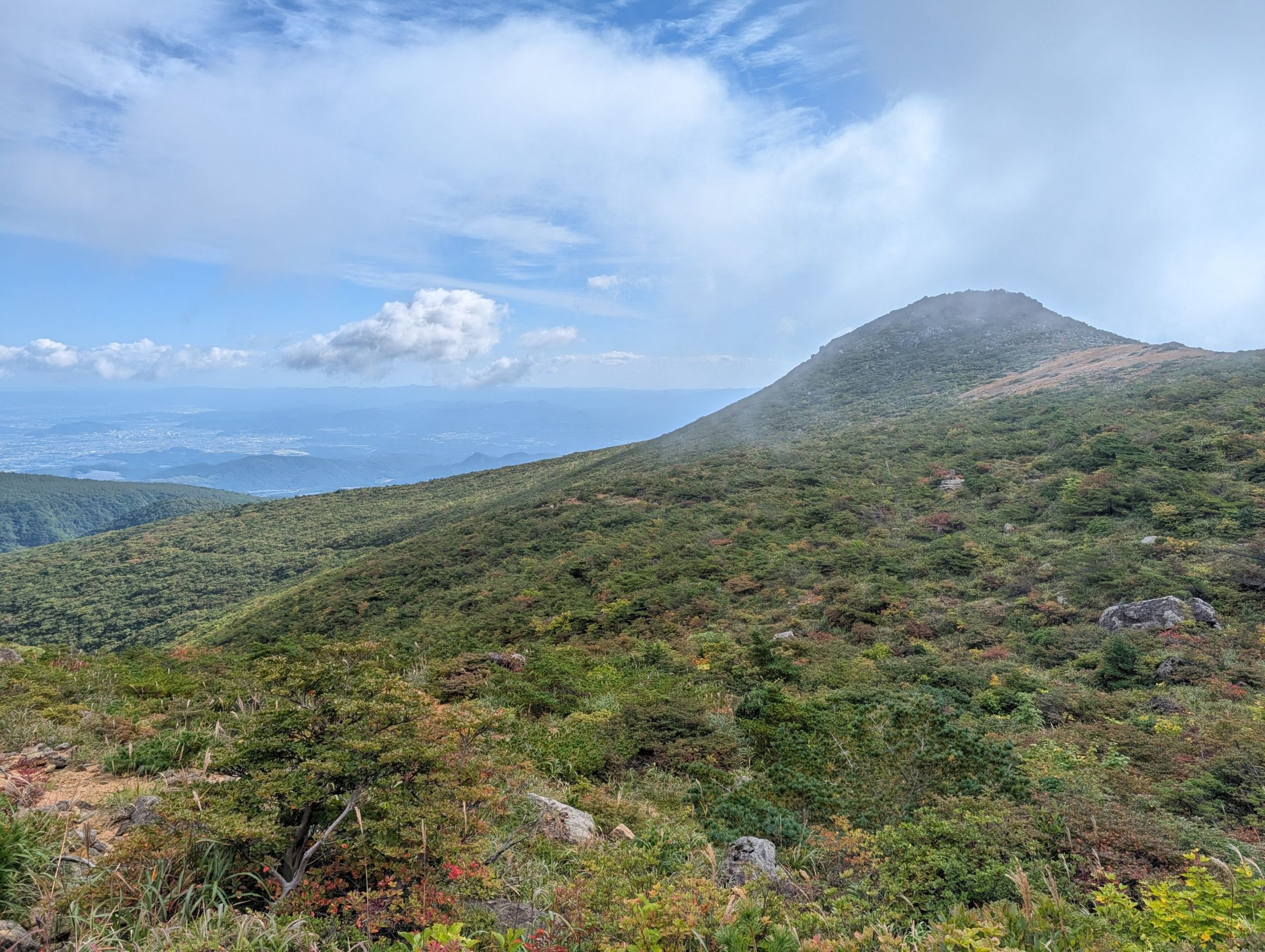 道は整備されているものの割と単調な登りを続けると、平坦な場所に出て初めて視界が開けてきます。一部紅葉をしている木もあって景色もいい感じ。ただ、上の方はだいぶ雲に覆われていて、この先の天気が少し心配。