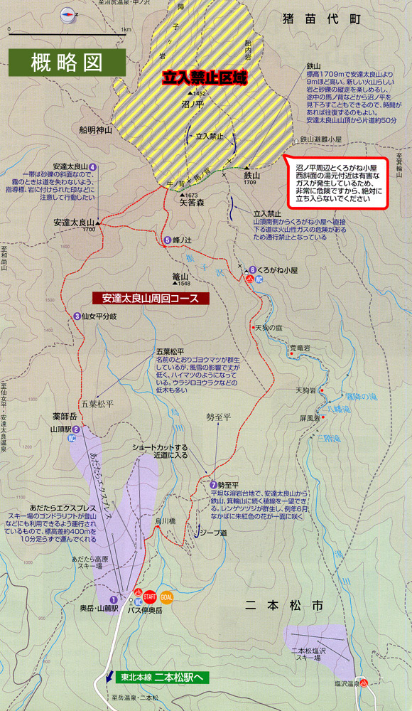 安達太良山の登山道はこの地図のように周遊が可能になっています。最初に考えたのが夏季も運転しているスキー場のゴンドラ「あだたらエクスプレス」で山頂駅まで行って、安達太良山山頂に向かい、その後くろがね小屋で温泉に入って、勢至平を経由して下山するというものでした。ただ、それだと登山らしく無いなというのと、ゴンドラの運転開始時間が思ったよりも遅いので、それとは逆向きのルートで周回し、ゴンドラに乗るかどうかはその時の疲れや天候次第でということにしました。