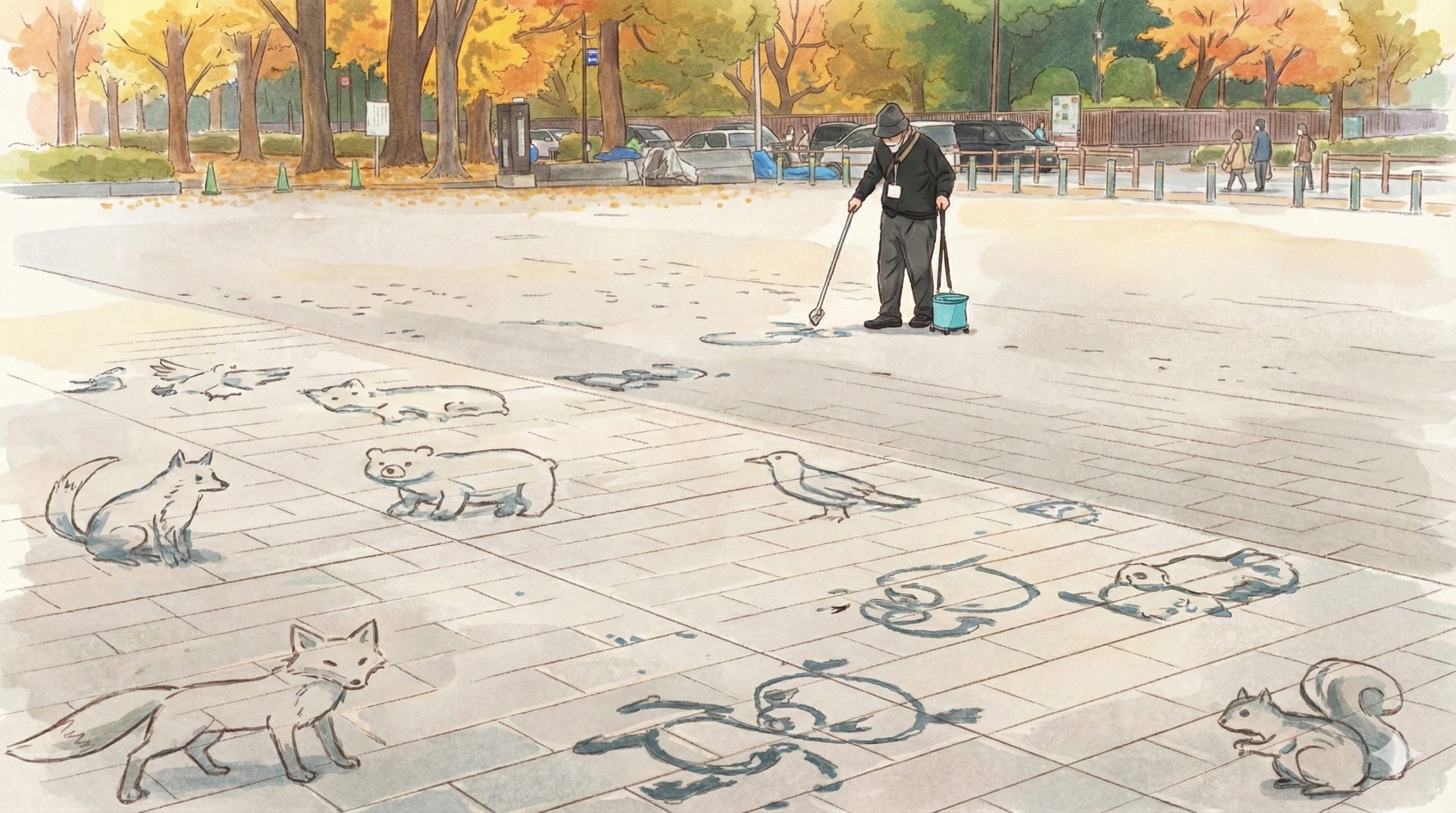 上野公園で可愛らしい動物を水で描く素敵なおじさんがいました