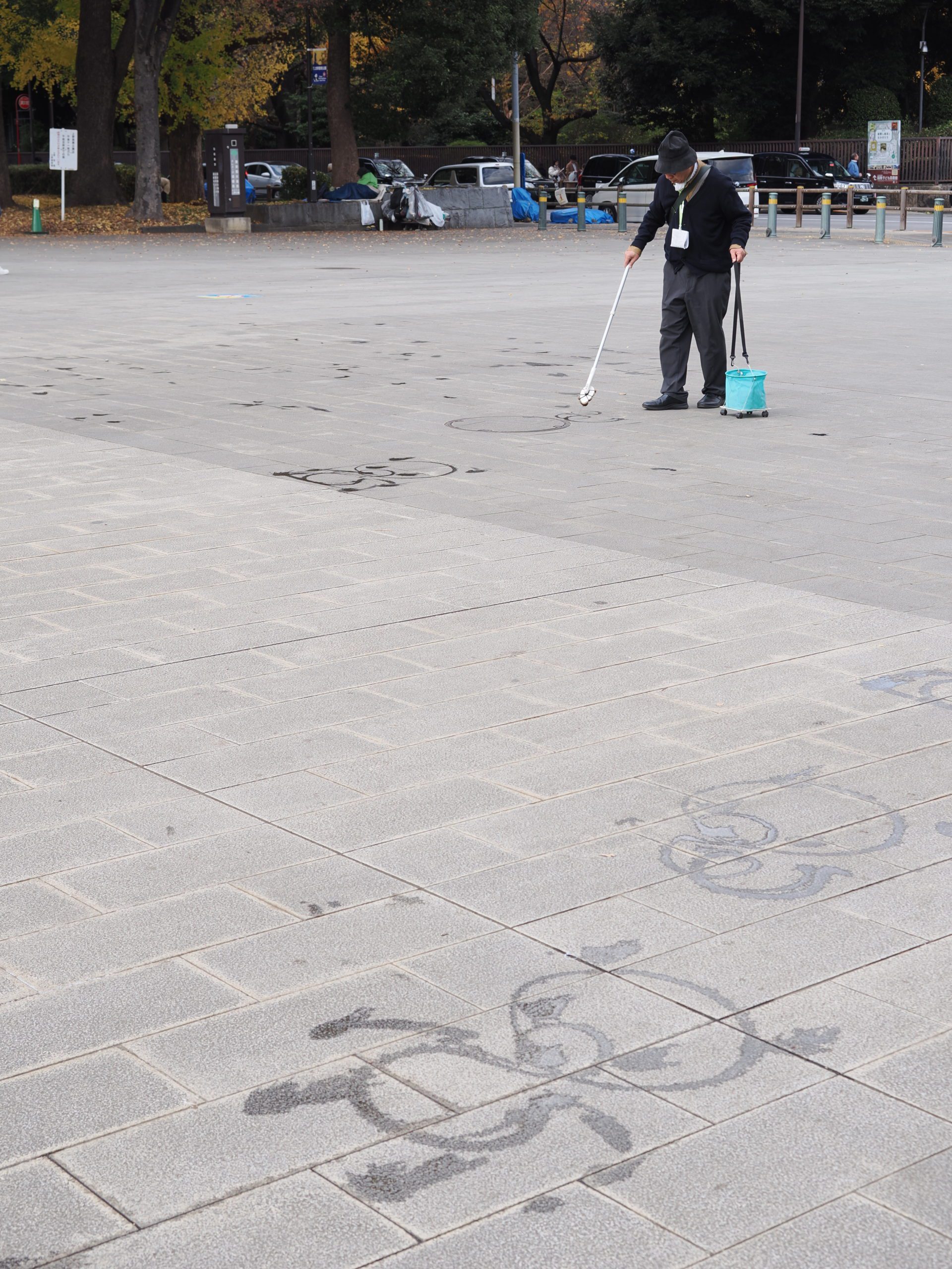 東京国立博物館に向かう際に上野公園の中を通っていくわけですが、地面に可愛らしいパンダや動物の絵が水を使っていくつも描かれていて、なんだろうと思ってその絵のいくつかを追ってみると、おじさんが先にスポンジらしきものをつけた棒を器用に使ってさらさらと絵を描いていました。