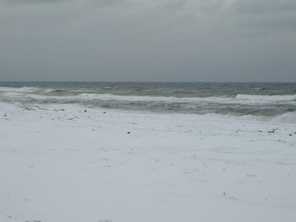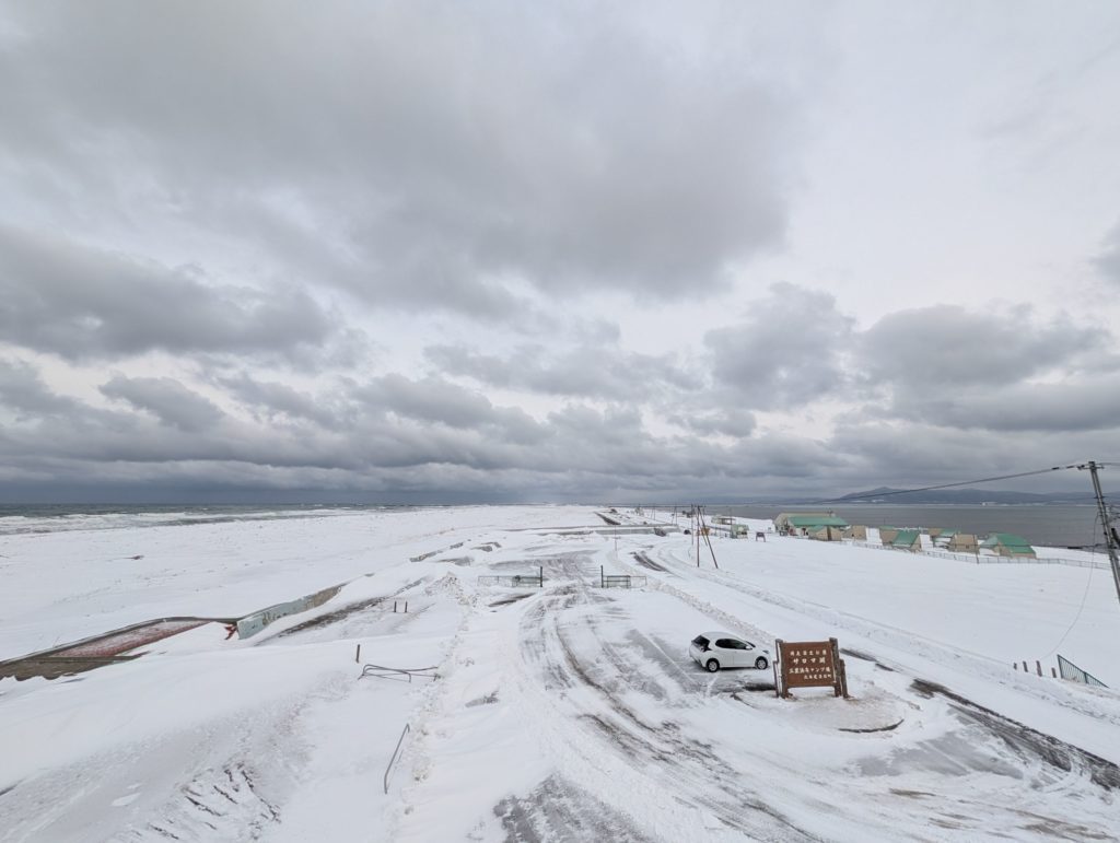流石に網走まで行く時間も余裕もないのですが、ふとサロマ湖は見てみたいと思い、オホーツク海とサロマ湖に挟まれた最果ての場所、三里浜キャンプ場に行ってみました。周りには何も無く、猛烈な風があって寒くてまさに最果ての地という感じでした。