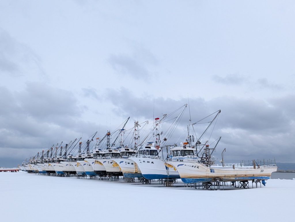風は強く海は荒れていて、船は綺麗に陸揚げされていて、冬の海の荒々しさを感じました。人の気配もほとんど無いので、ちょっと怖い感じすらありました。