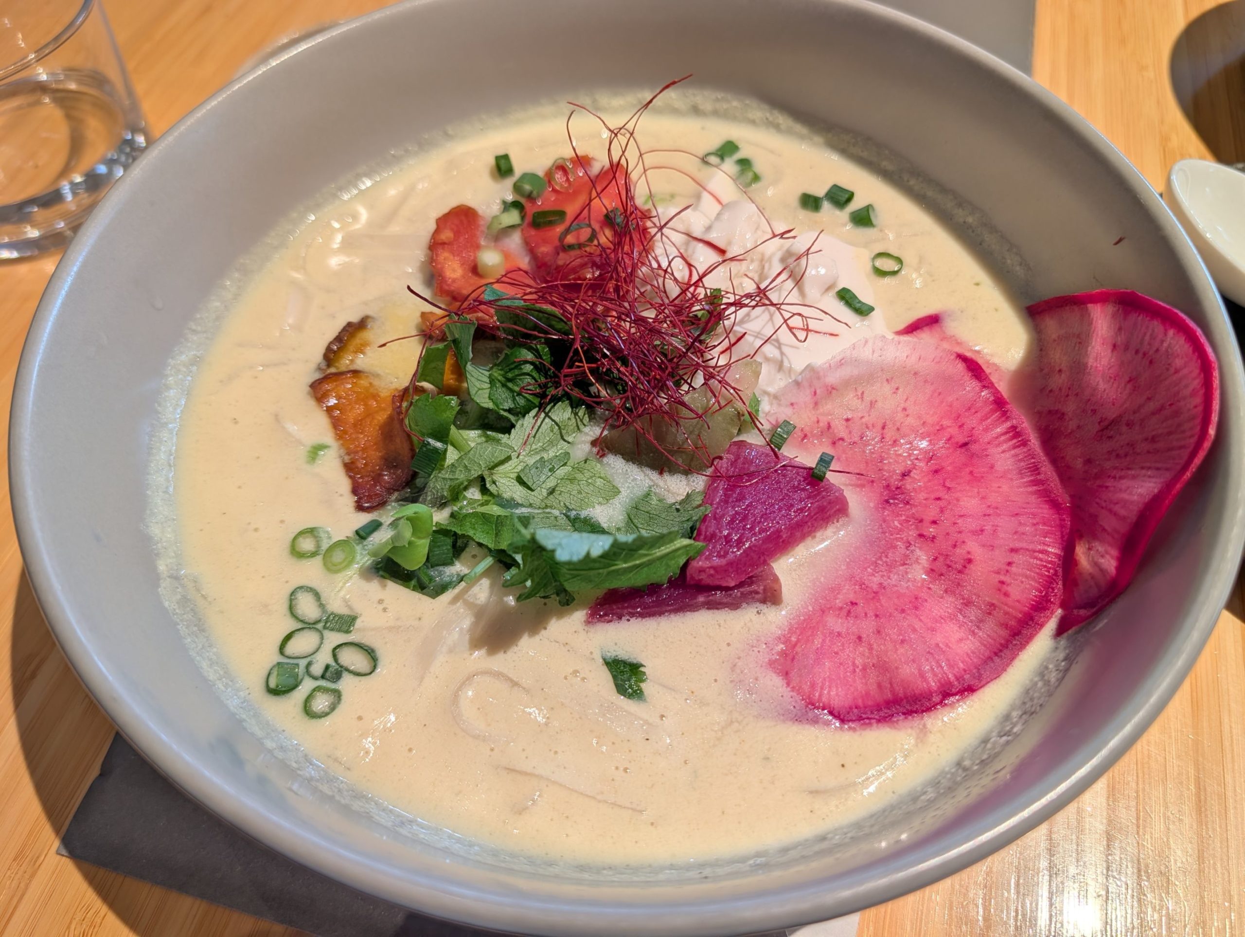 頼んだのは 四方八方豆腐と彩り野菜の豆乳麺、ビーガン・グルテンフリー対応のメニューでした。スウェーデン在住時にビーガンの方やグルテンフリーじゃないとダメという方がいたこともあったのですが、それでも自分がそれに対応したメニューを頂くということがなかったので興味津々。