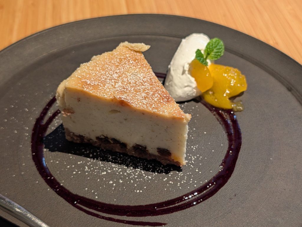 とは言え、やっぱりちょっと物足りない 笑。ということで、普段はあまり頼まないのですが、デザートも頼んでみました。こちらは、グルテンフリーのチーズケーキなのですが、言われなければグルテンフリーとはわからない美味しさ。ラムレーズンがしっかり効いていてすごく美味しかった。面白いなと思ったのはクリームで、ビーガンと書いてなかったので普通のクリームかと思いきや、多分豆乳をメインにして作ったクリームで、こちらは風味から明確に違いがわかる感じでした。