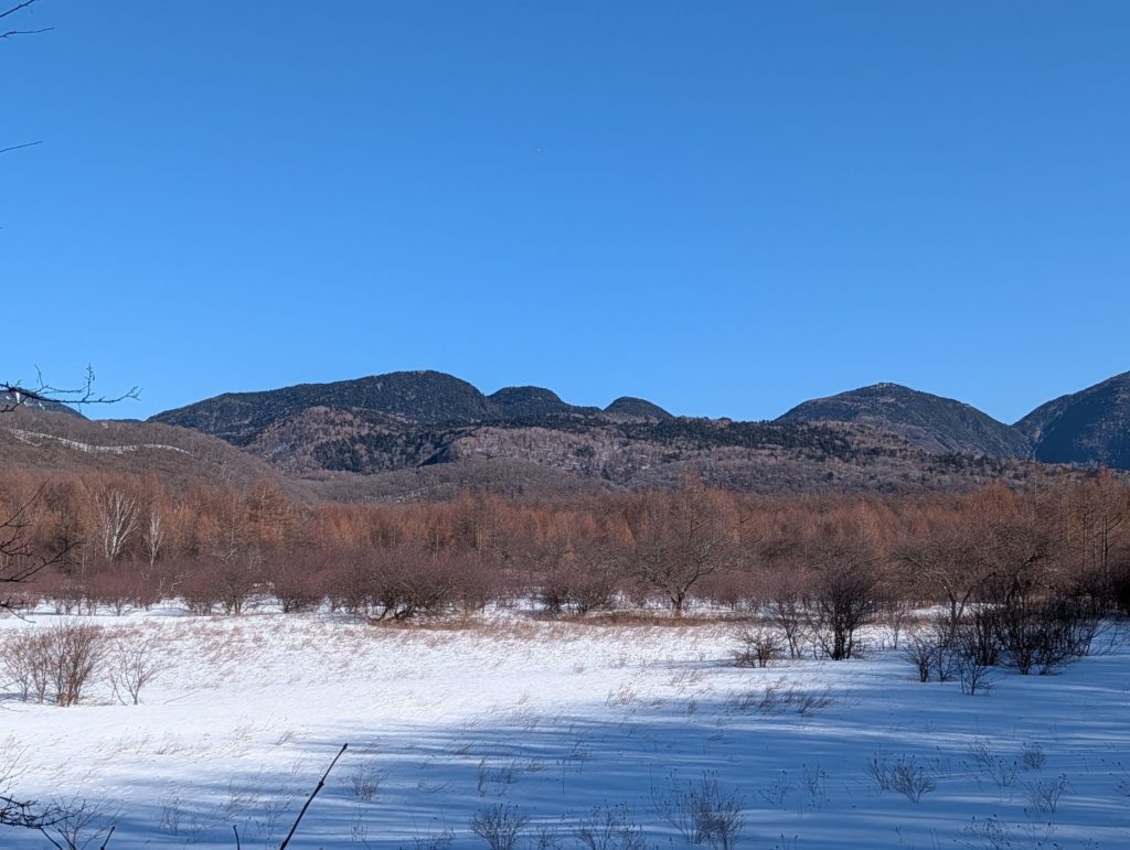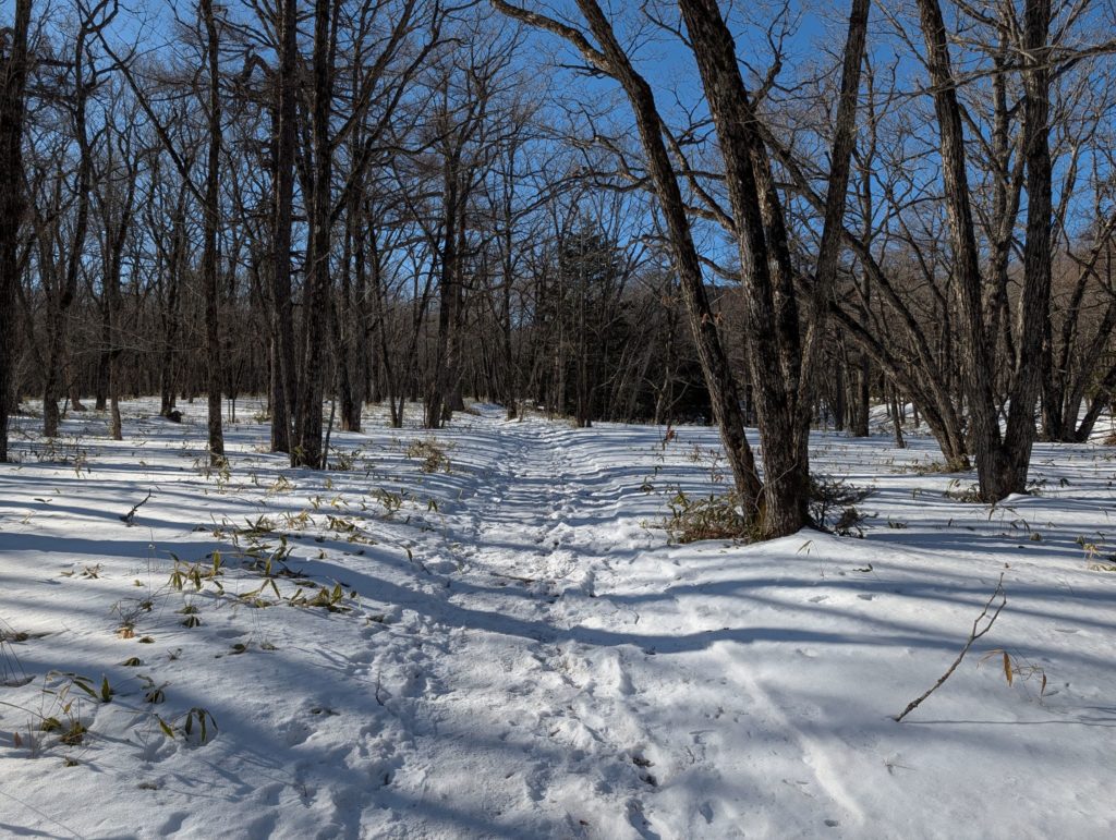 赤沼から戦場ヶ原へと入っていく遊歩道には雪があり、一部凍りついていました。とは言え、雪の量は比較的少なくて持ってきたチェーンスパイクがぴったりな感じ。ザクザクと音を立てながら固く締まった雪の上を歩くのは本当に気持ちが良いです。