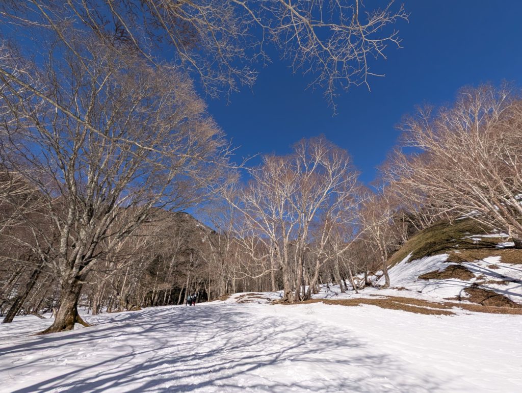 道中の大部分は比較的平坦で、道迷いにしっかり気をつければ気持ちよく歩くことができる場所がほとんどでした。実際に注意が必要だと感じたのは滝の周囲で、滝に近づこうとする際に足を踏み外したり、雪の踏み抜きで渓流に落ちる危険がありそうな場所があるなと感じましたし、滝近くの斜面は相応に急な斜面になっていて、雪崩が起きる可能性に注意が必要だと感じました。