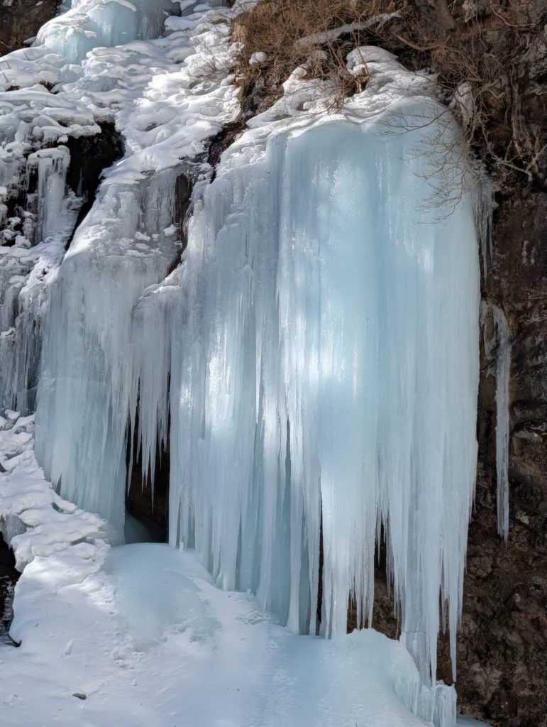 氷瀑に近づくと、そのスケールにまず驚き、そして陽にあたり薄っすらと青くきらきらと輝く様に見とれてしまいます。こんな造形を作り出してしまう自然のすごさに畏怖を感じるくらいの景観でした。