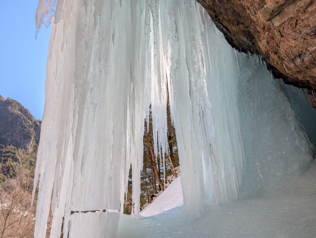 注意しながら滝の裏側にも入ってみました。陽の当たり方だと思うのですが、氷柱がより一層青く見えて非常に美しかったです。一方で、2枚めの写真などからもわかると思いますが、暖かくなり始めていて、氷柱にはヒビが入っていたり割れている部分もあり、そろそろ崩落するのでは?という雰囲気も感じました。