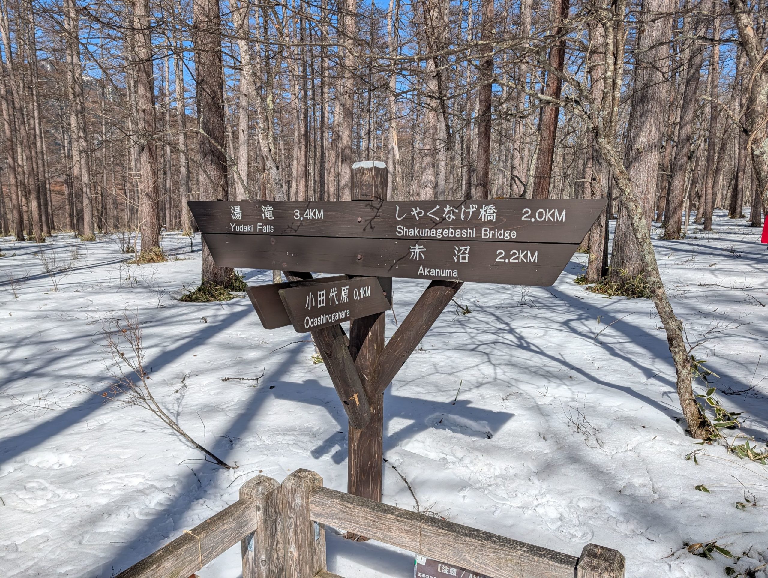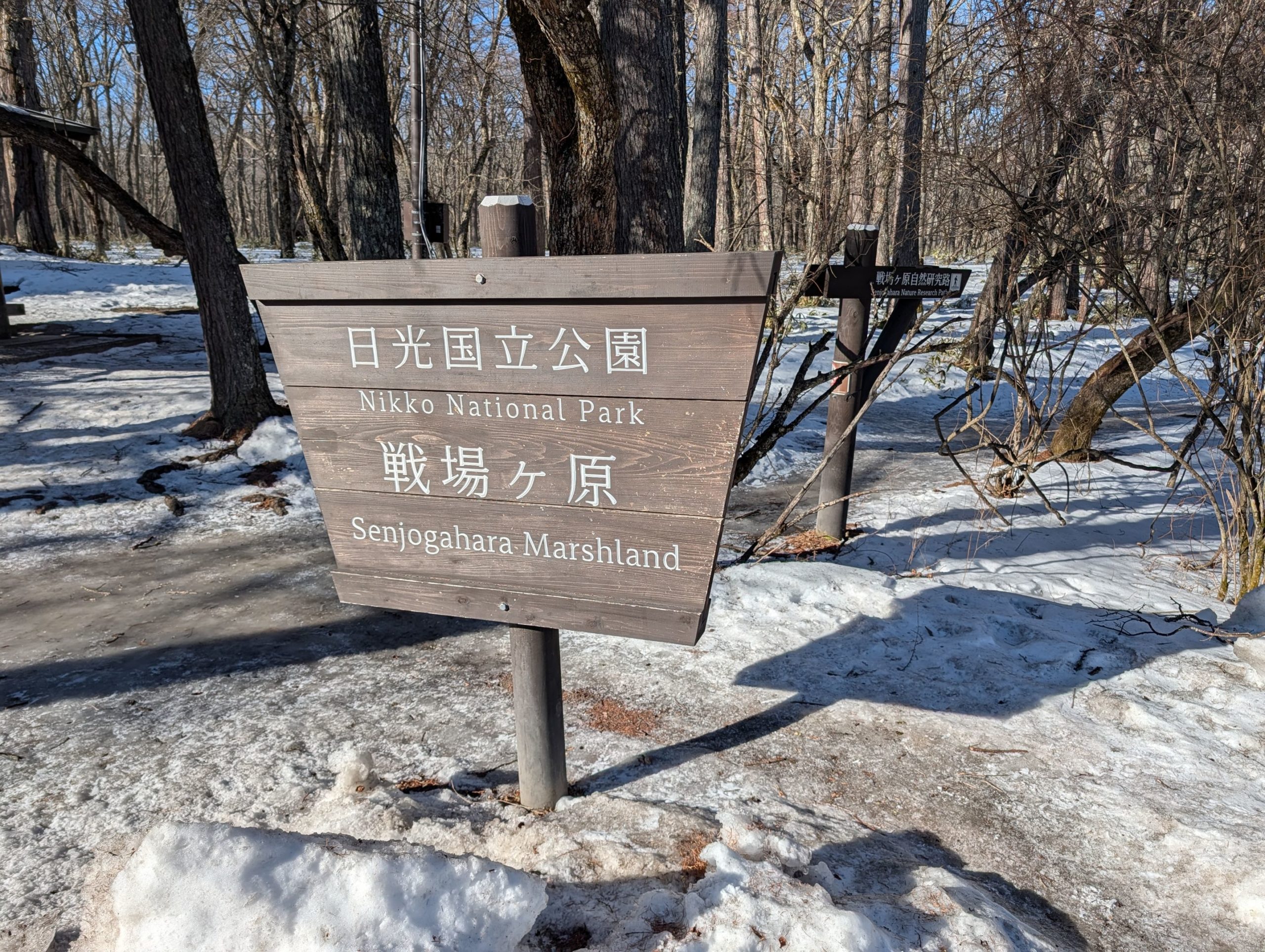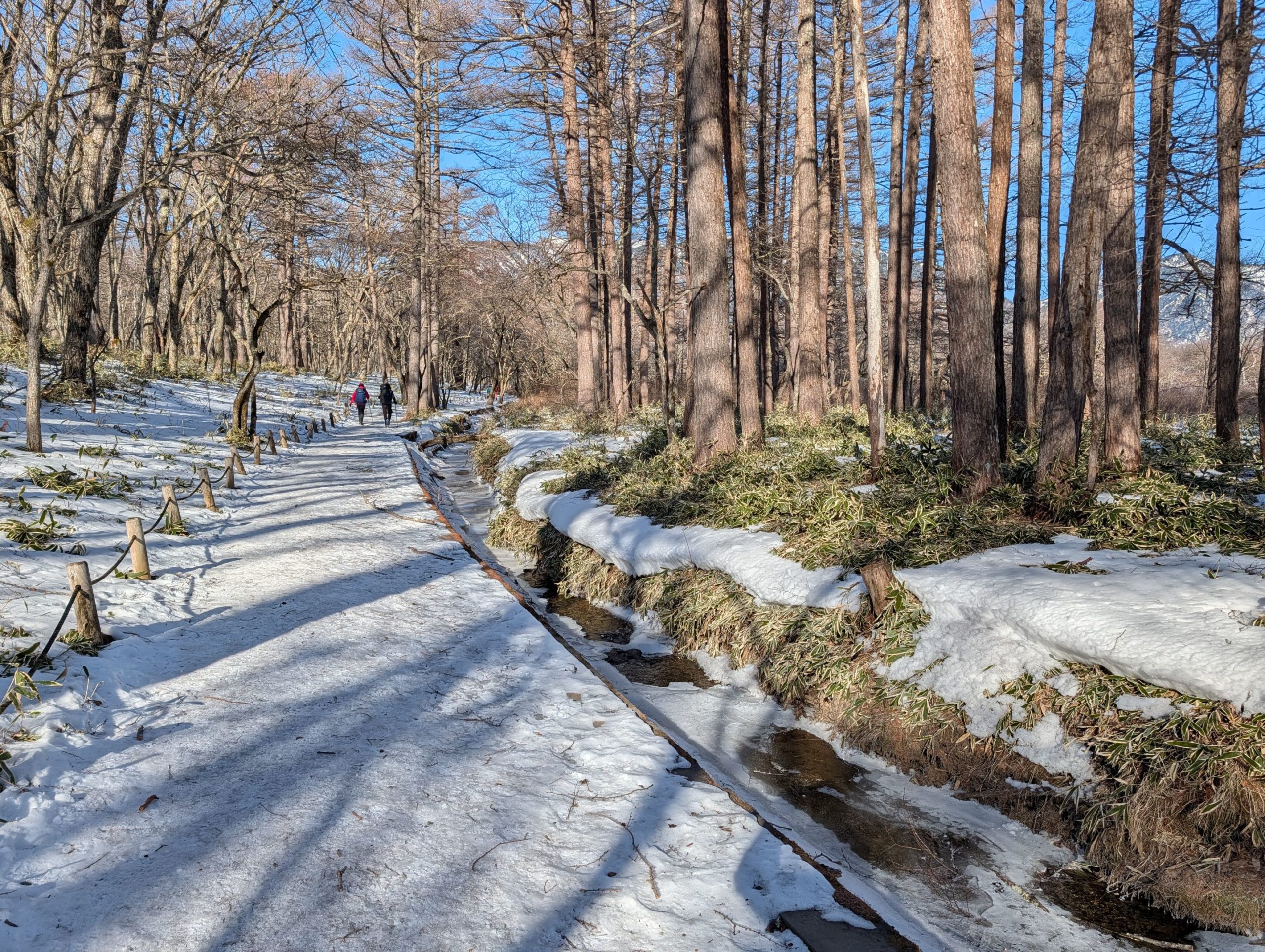 赤沼から戦場ヶ原へと入っていく遊歩道には雪があり、一部凍りついていました。とは言え、雪の量は比較的少なくて持ってきたチェーンスパイクがぴったりな感じ。ザクザクと音を立てながら固く締まった雪の上を歩くのは本当に気持ちが良いです。
