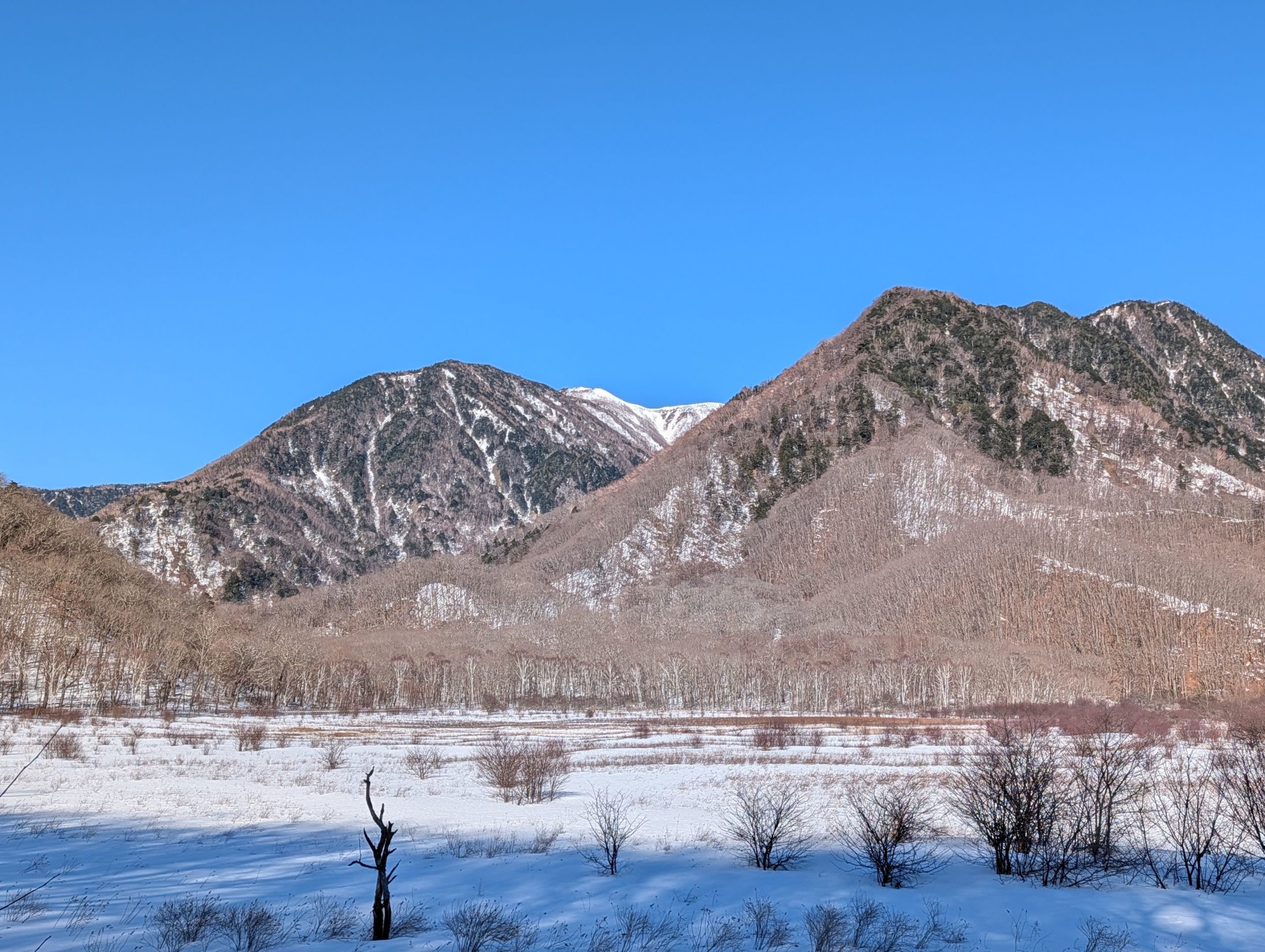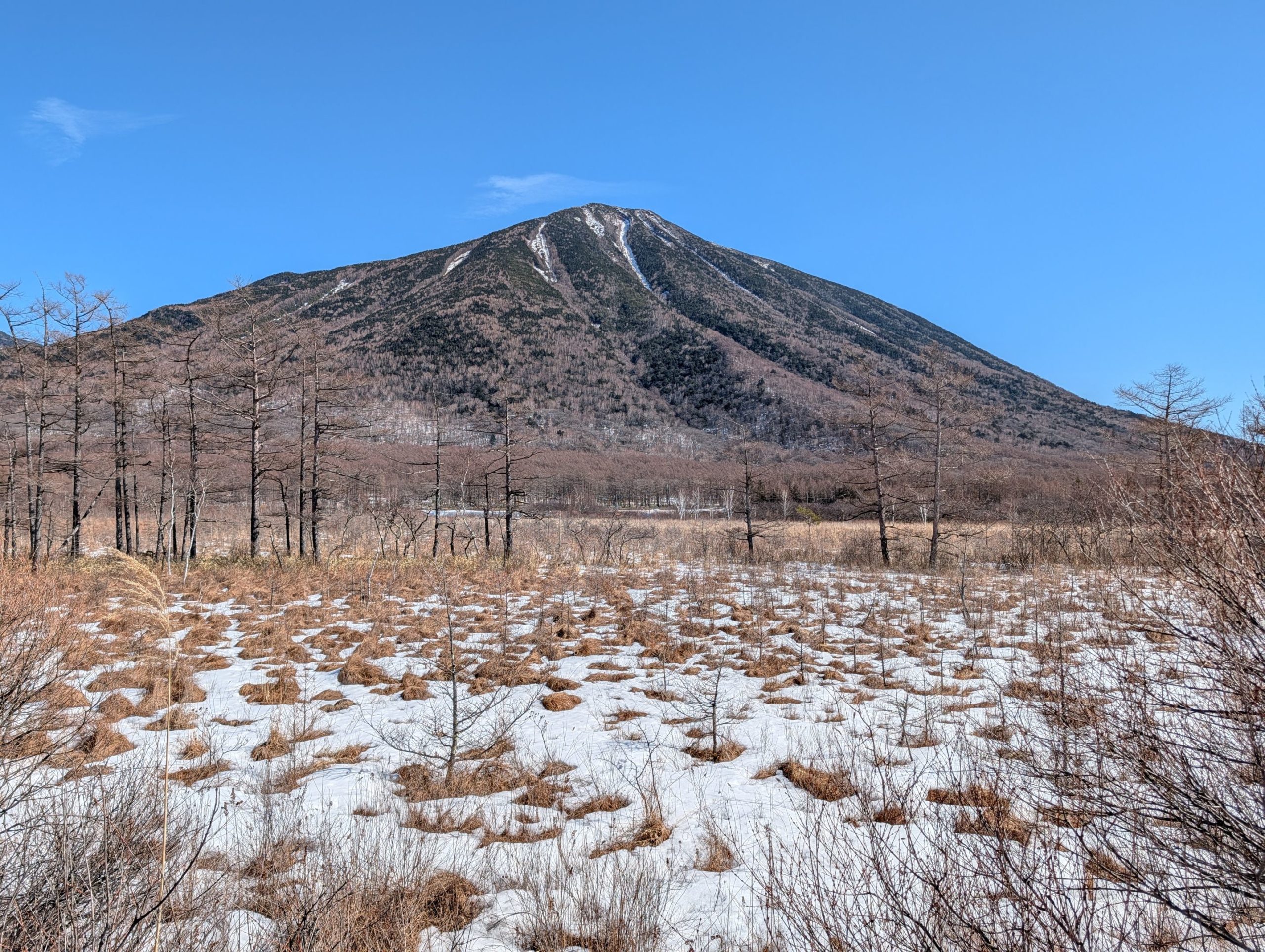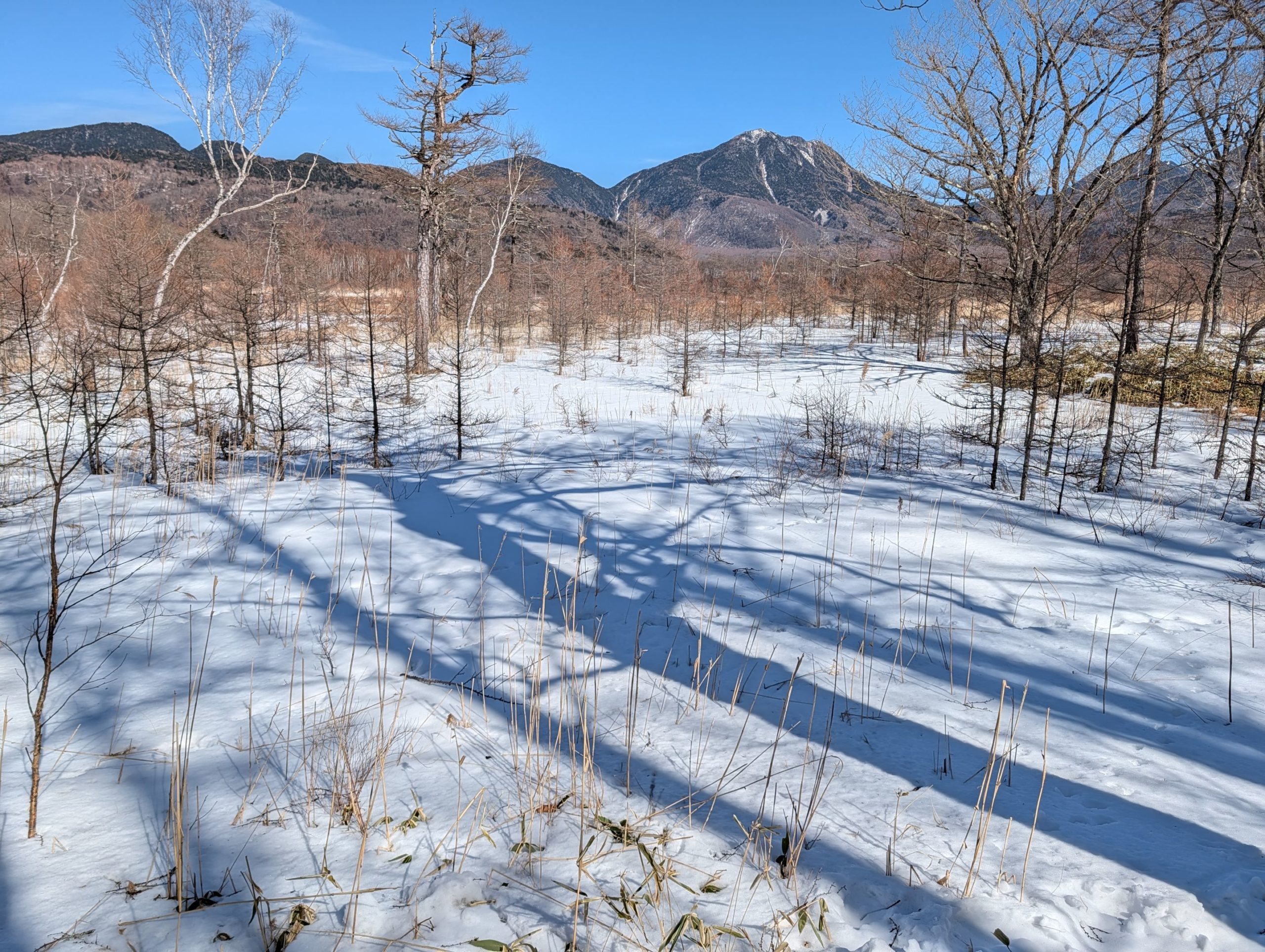 赤沼から戦場ヶ原へと入っていく遊歩道には雪があり、一部凍りついていました。とは言え、雪の量は比較的少なくて持ってきたチェーンスパイクがぴったりな感じ。ザクザクと音を立てながら固く締まった雪の上を歩くのは本当に気持ちが良いです。