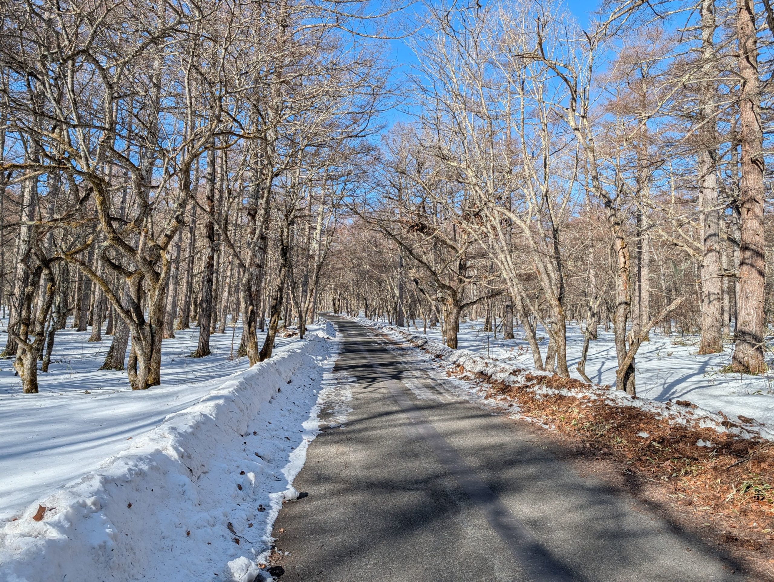 コンクリートの林道については、雪がついていない場所がありましたが、チェーンスパイクを持ってきて大正解でした、脱着が簡単なのでこういう時すごく楽。