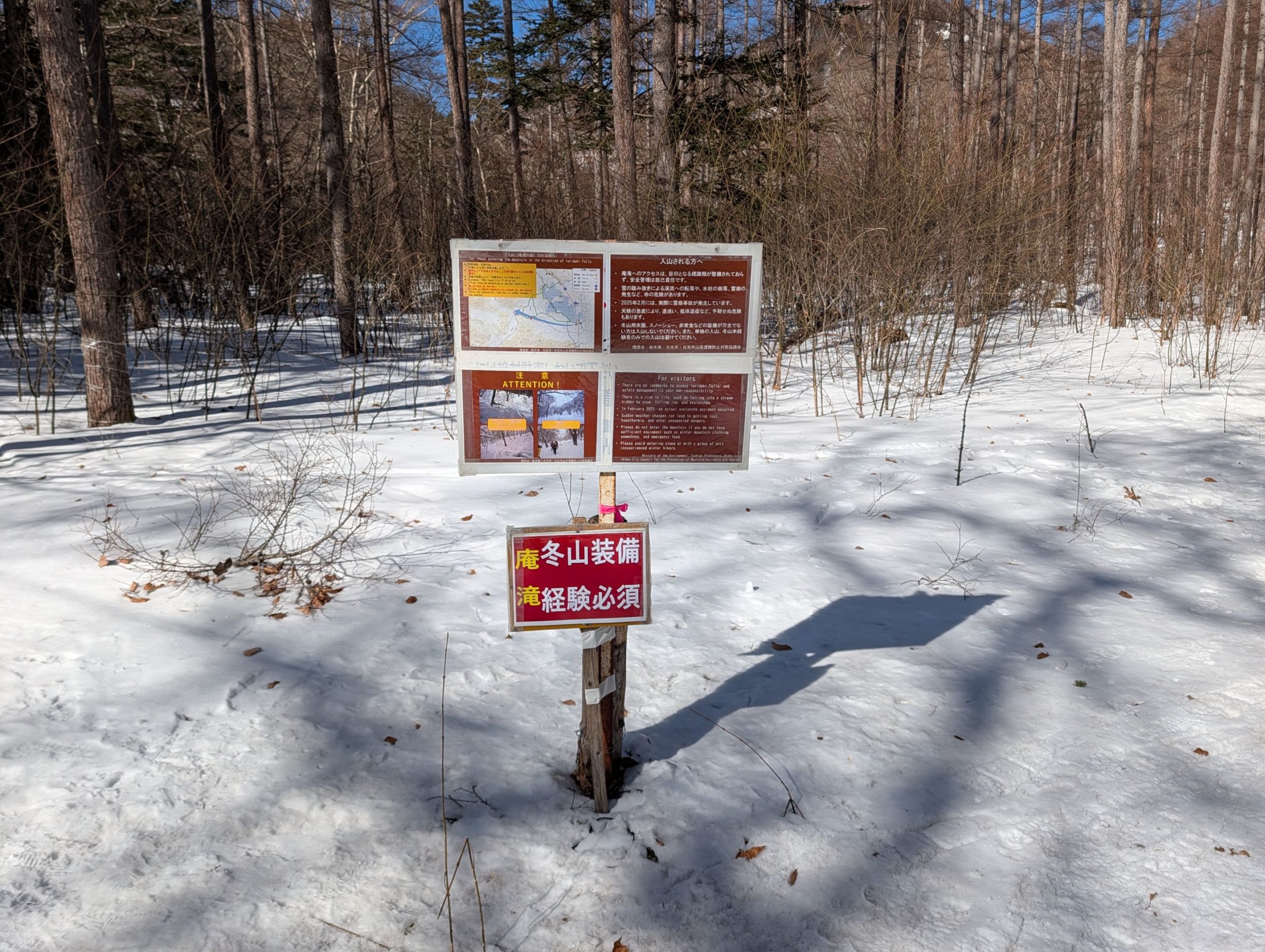 林道から庵滝へと至る分岐には、注意を促す看板がありました。看板には「庵滝へのアクセスは、目印となる標識類が整備されておらず、安全管理は自己責任です。雪の踏み抜きによる渓流への転落や、氷柱の崩落、雪崩の発生など命の危険があります。」と相応の注意が必要な場所であることが明記されています。