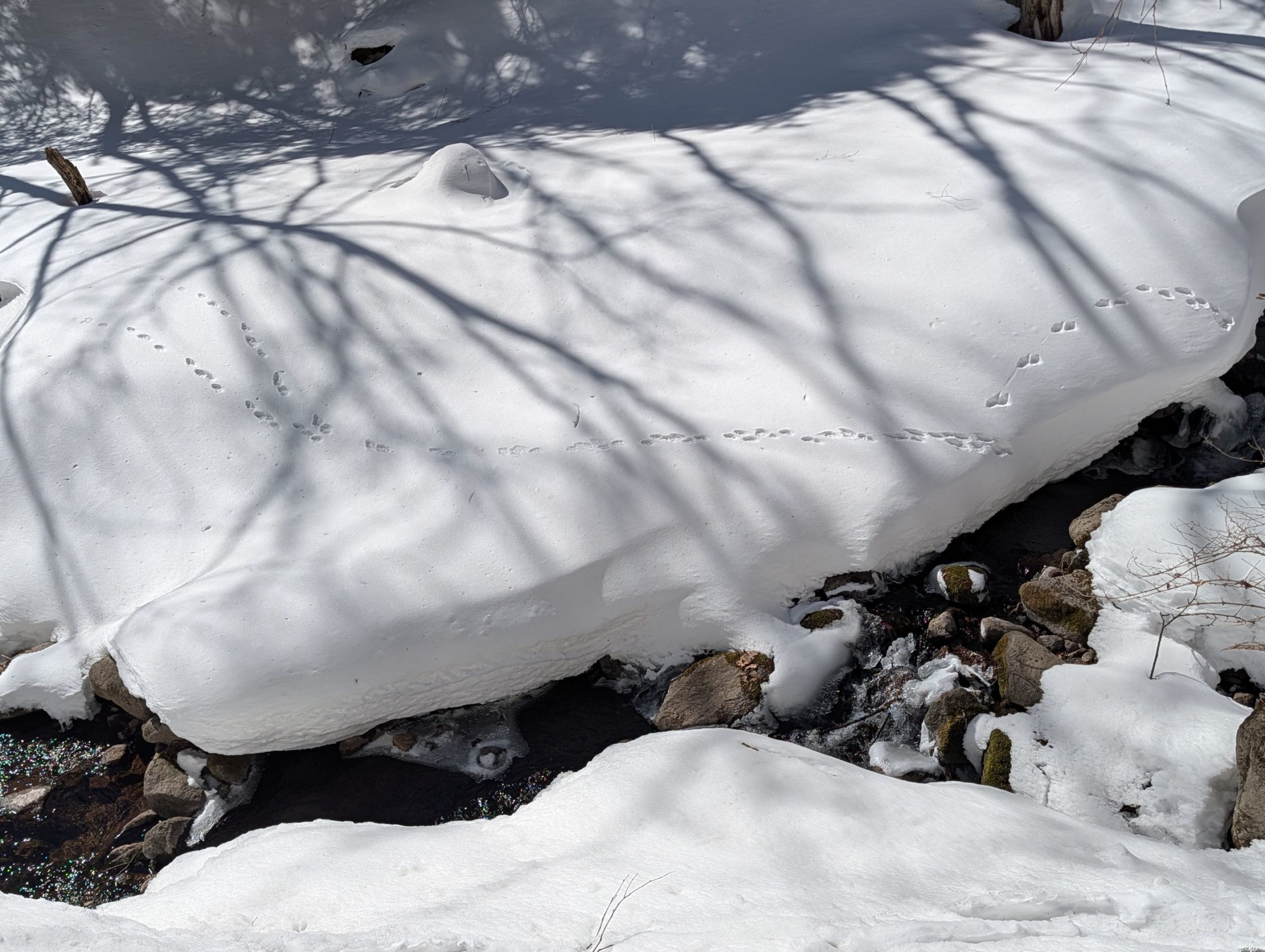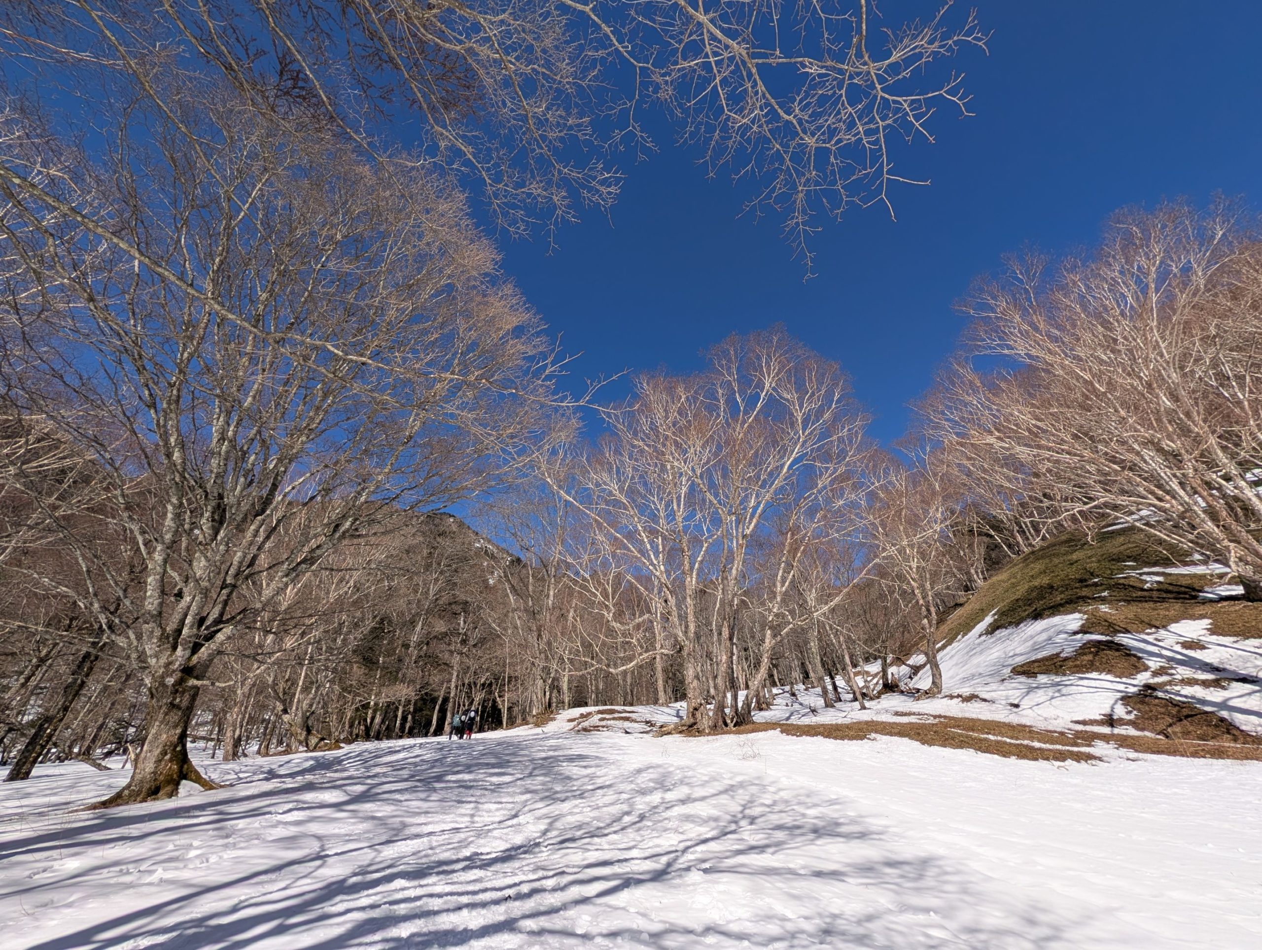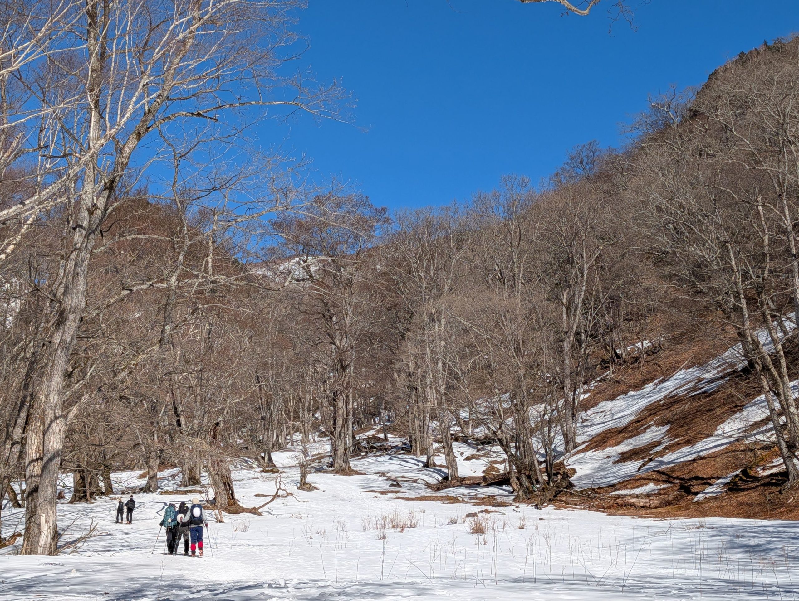 道中の大部分は比較的平坦で、道迷いにしっかり気をつければ気持ちよく歩くことができる場所がほとんどでした。実際に注意が必要だと感じたのは滝の周囲で、滝に近づこうとする際に足を踏み外したり、雪の踏み抜きで渓流に落ちる危険がありそうな場所があるなと感じましたし、滝近くの斜面は相応に急な斜面になっていて、雪崩が起きる可能性に注意が必要だと感じました。