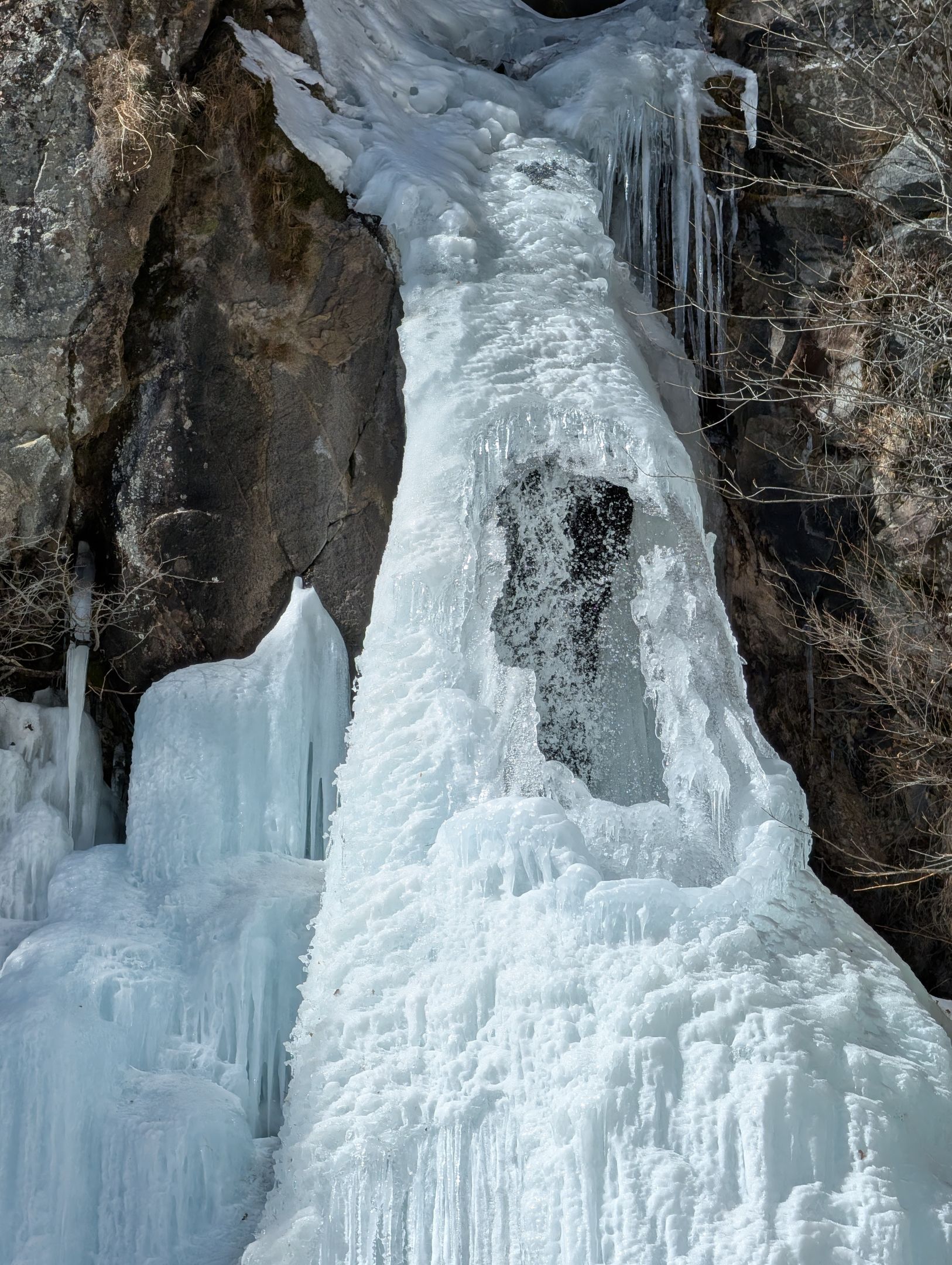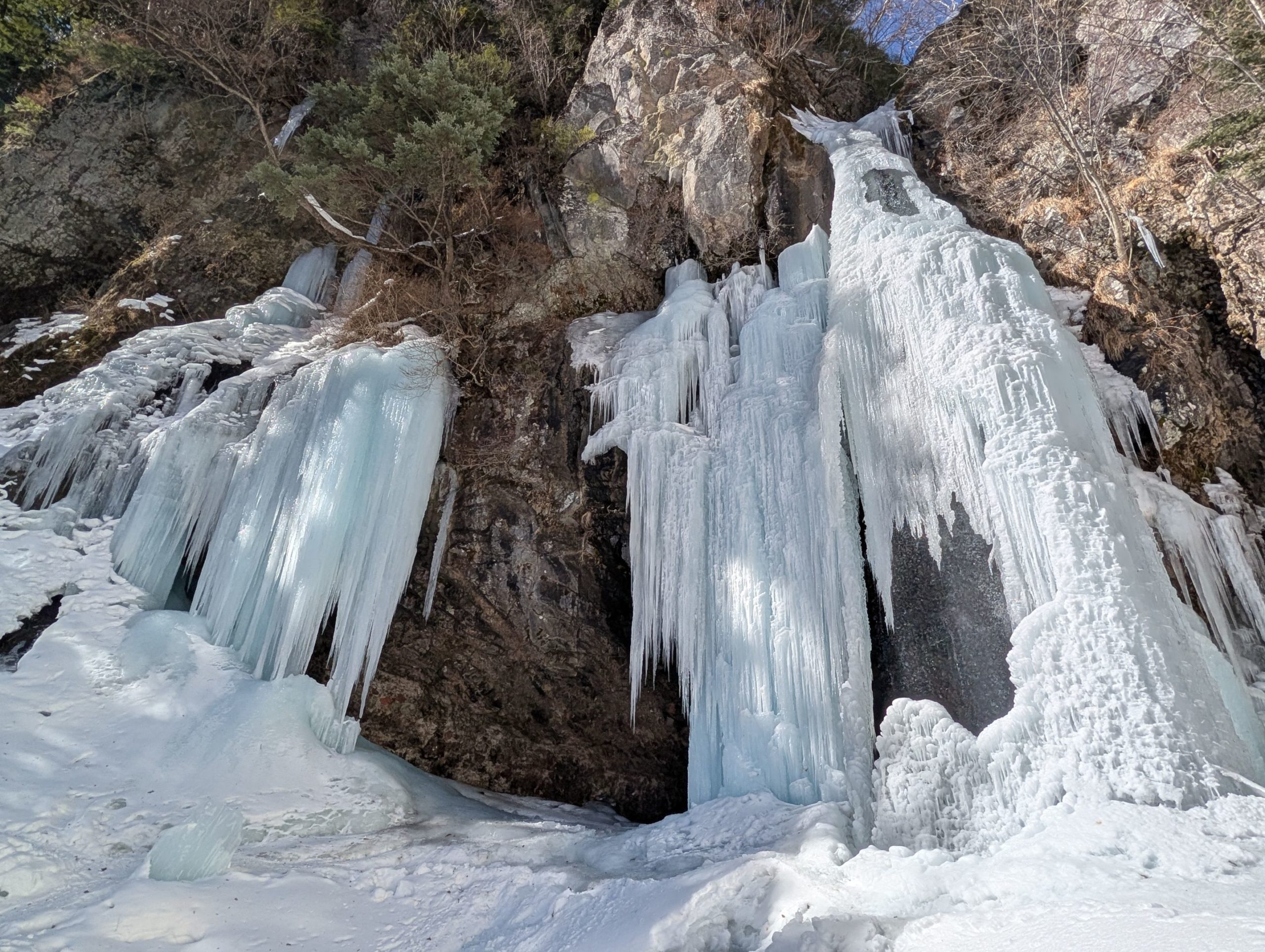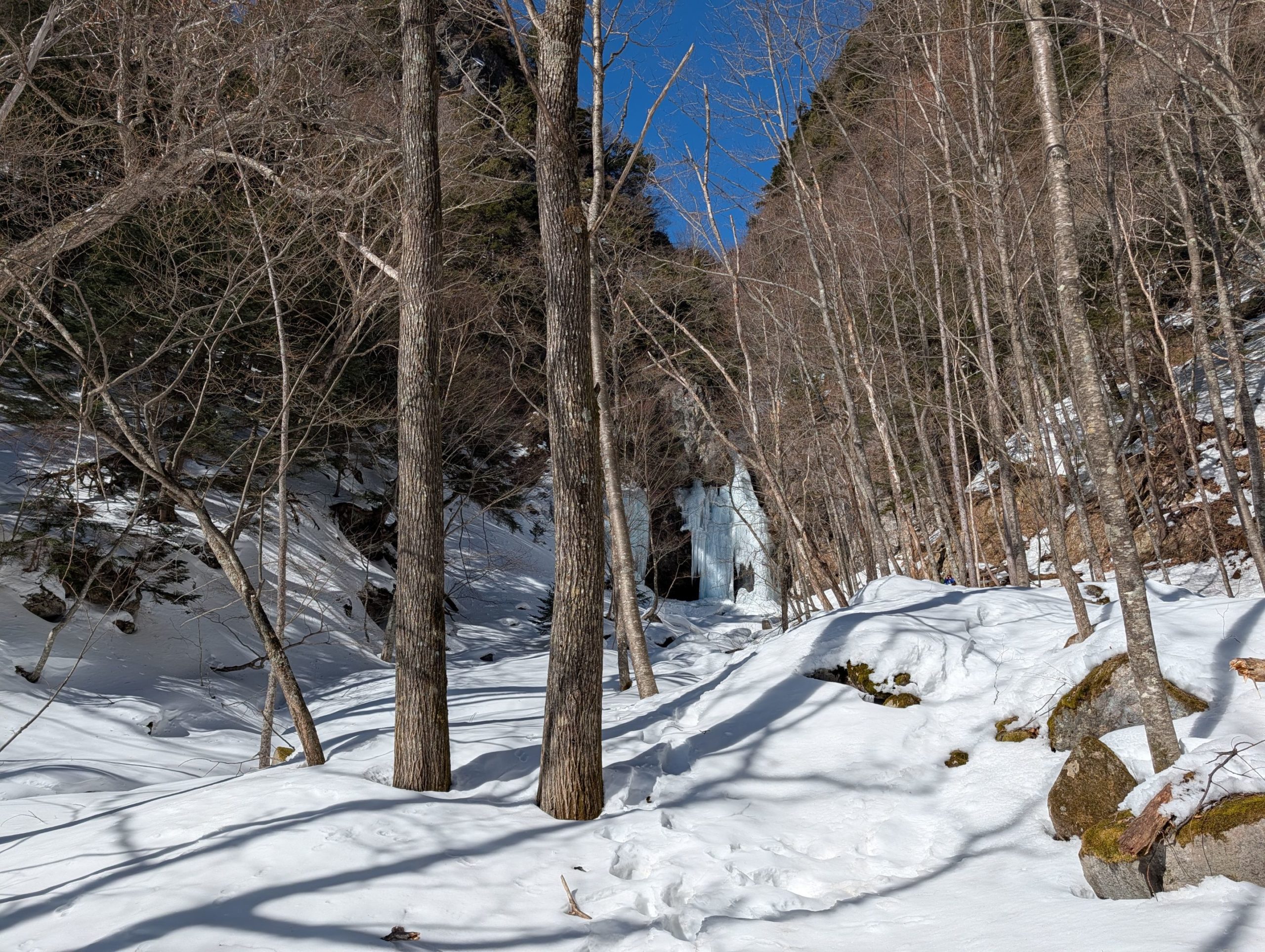 YAMAP の地図で見ていたよりも、だいぶ歩いたかなと思っていたところで氷瀑が見えてきました、遠目からもかなり凄い氷瀑だというのがわかります。