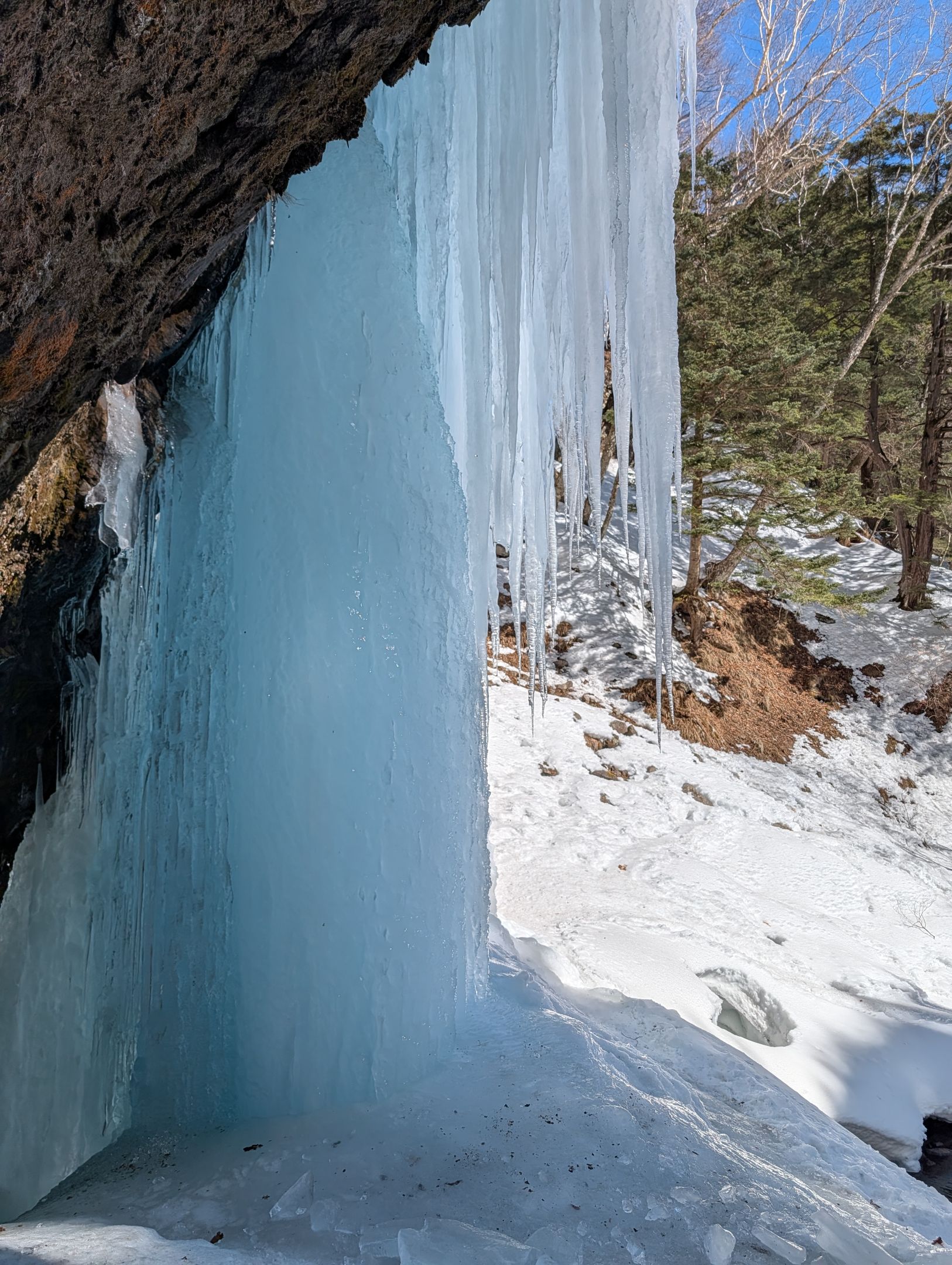 注意しながら滝の裏側にも入ってみました。陽の当たり方だと思うのですが、氷柱がより一層青く見えて非常に美しかったです。一方で、2枚めの写真などからもわかると思いますが、暖かくなり始めていて、氷柱にはヒビが入っていたり割れている部分もあり、そろそろ崩落するのでは?という雰囲気も感じました。